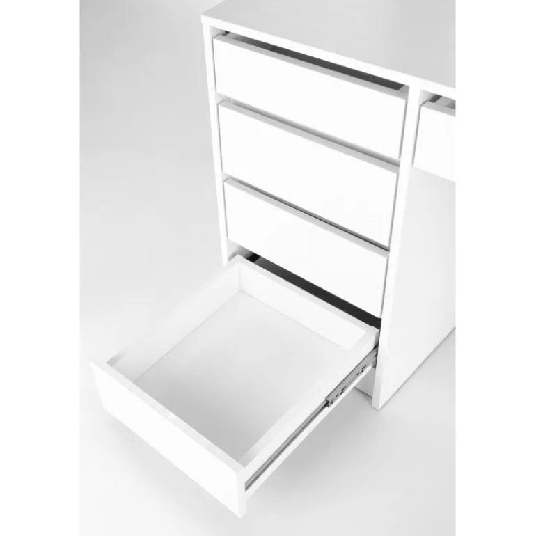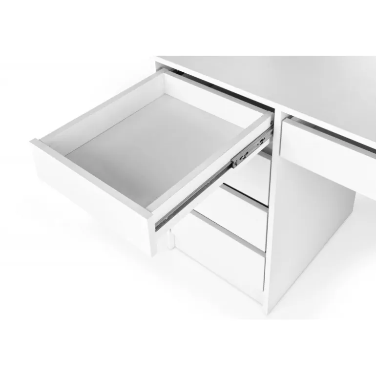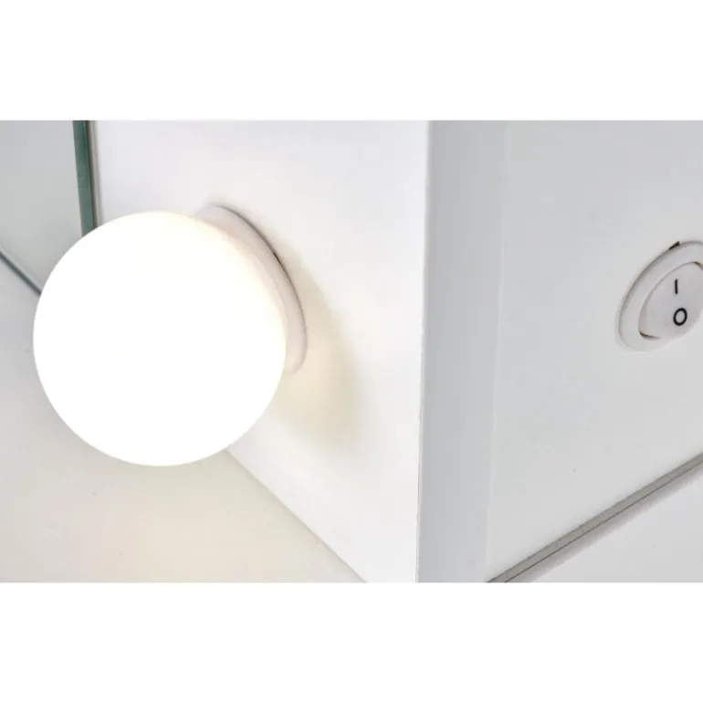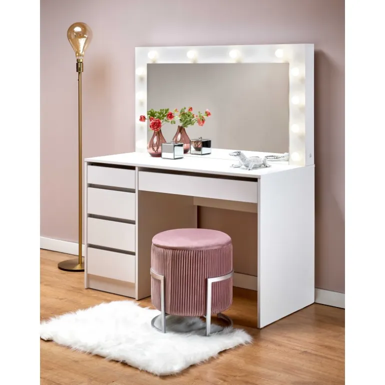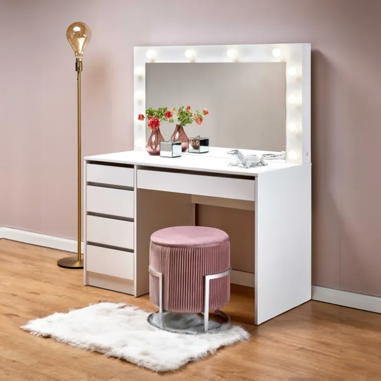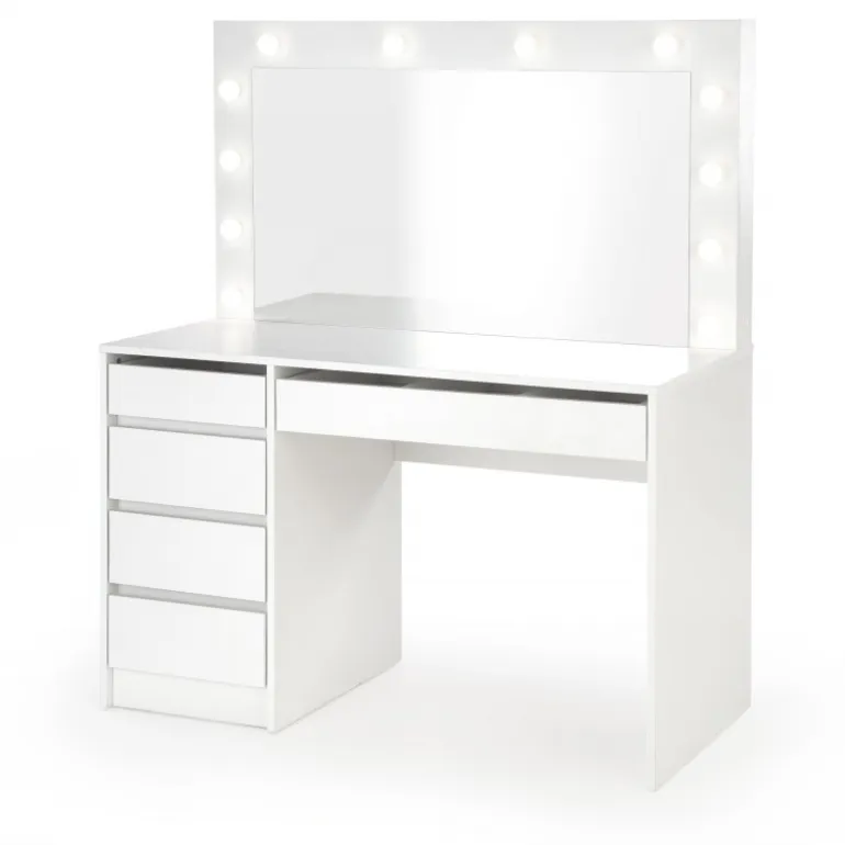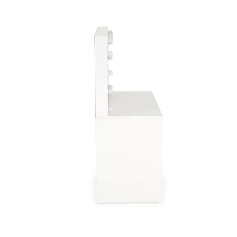HOLLYWOOD Sminkebord i hvid er den ideelle løsning til dit soveværelse . Med dimensionerne 120/55/140 cm tilbyder dette bord rigelig plads til at organisere dine arbejdsredskaber. Det er fremstillet af lamineret spånplade og inkluderer LED-lys, der skaber en moderne og stilfuld atmosfære. Dette Sminkebord kombinerer funktionalitet og æstetik, hvilket gør det til et perfekt valg for enhver, der ønsker at forbedre deres soveværelse.