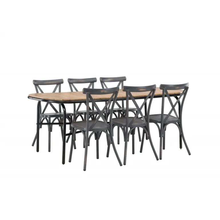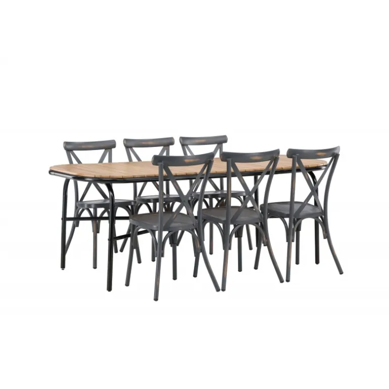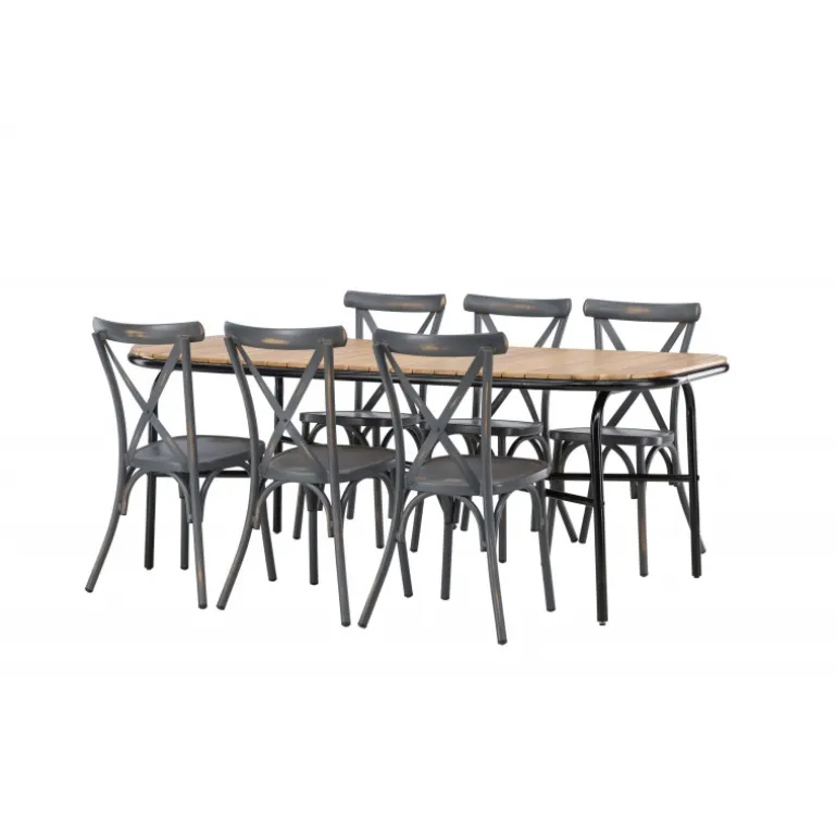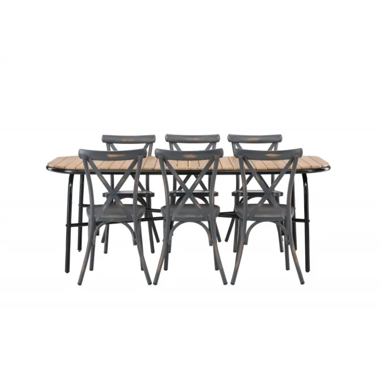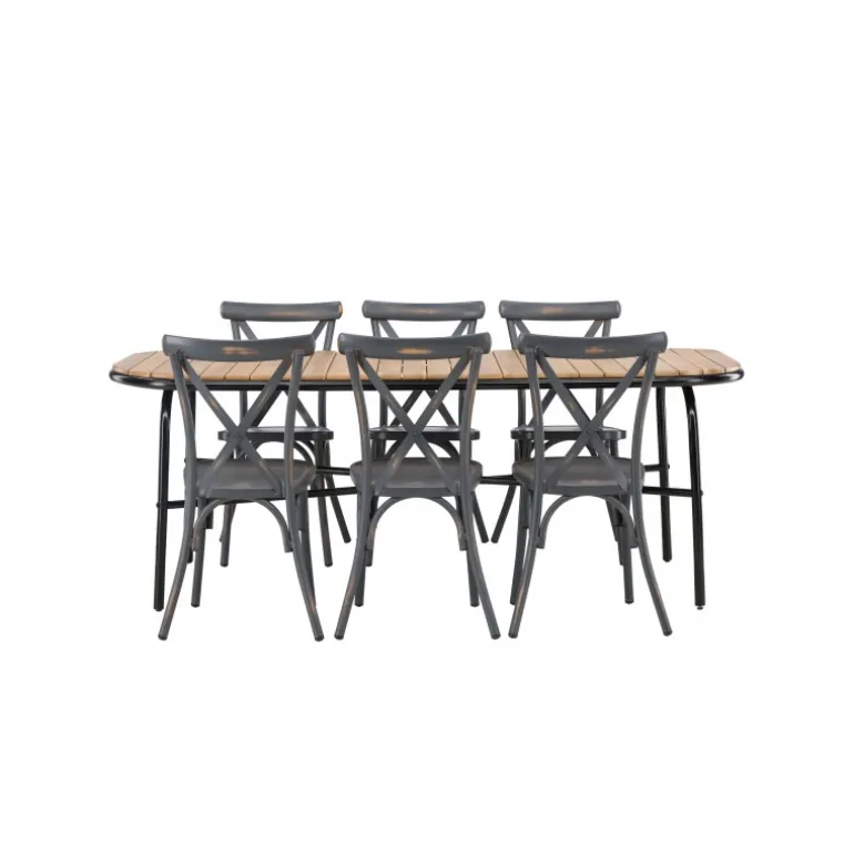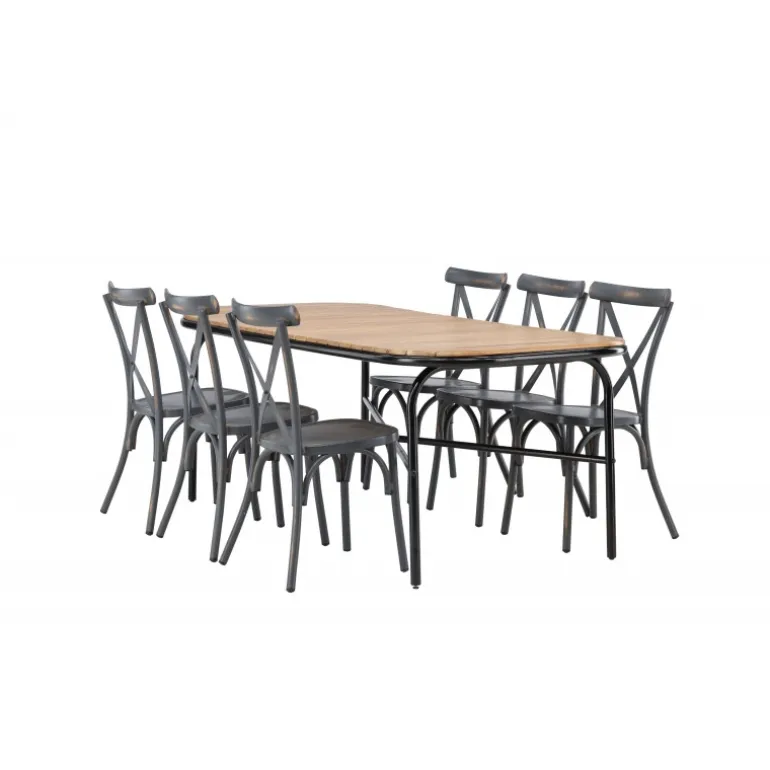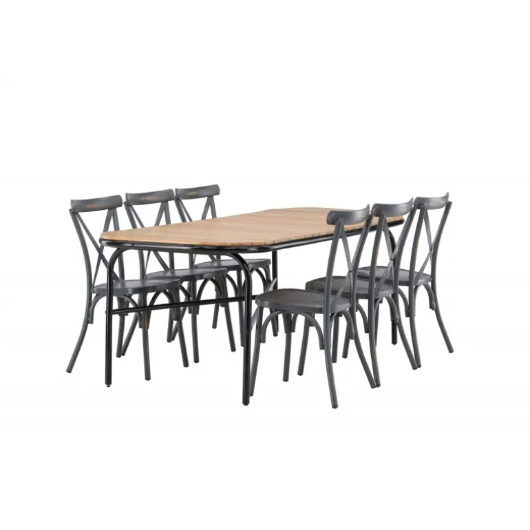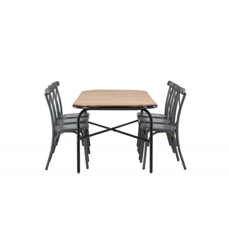 Kombinationen af Holmbeck bordet og Tablas stolene er perfekt til terrassen denne sommer! Bordet har en rektangulær bordplade i elegant akacietræ med afrundede kanter og en minimalistisk base i sort stål. Stolene har en industriel stil og er lavet af holdbart aluminium i en sodet sort farve. Loungesæt – Havemøbelsættet er velegnet til udendørs brug, men passer selvfølgelig også perfekt i udestuen! Bordets mål: 200x90x75cm.