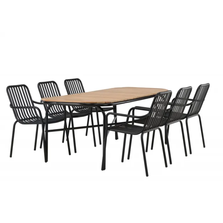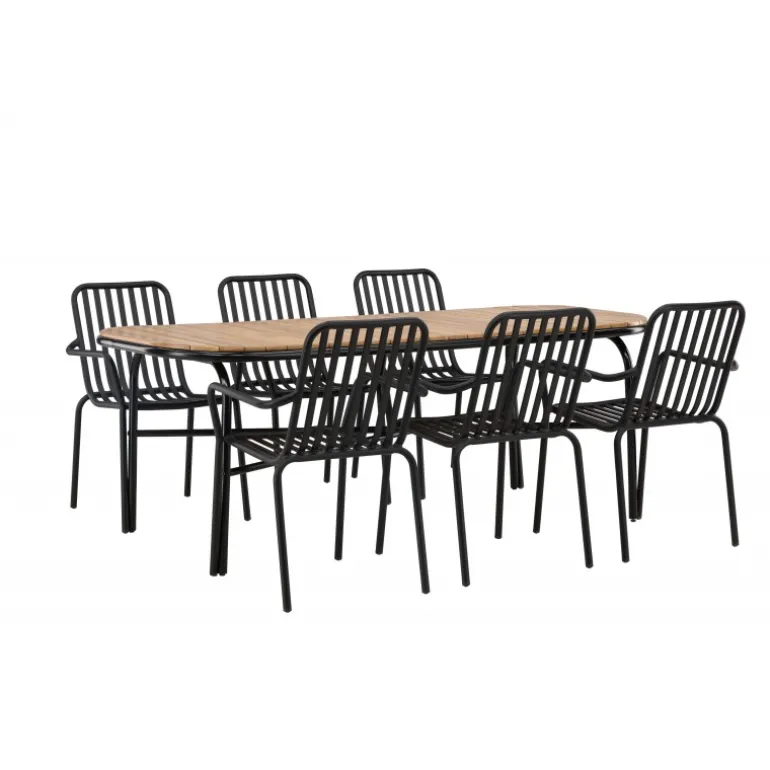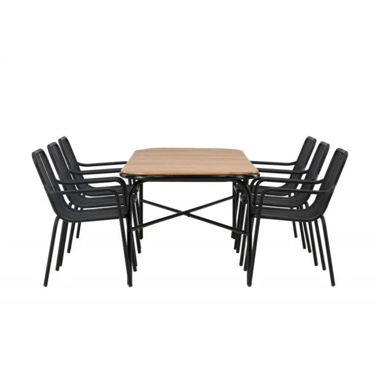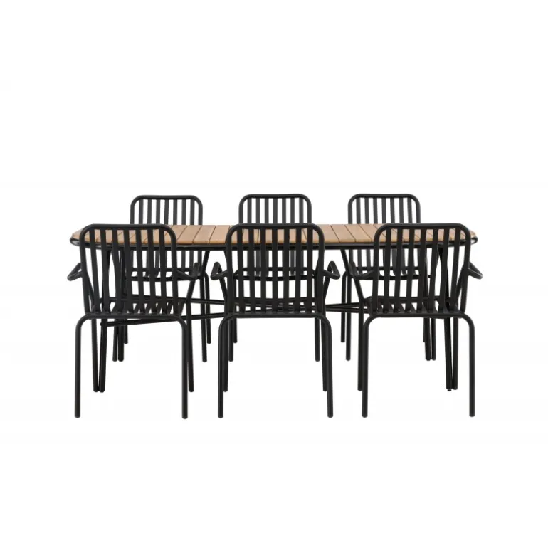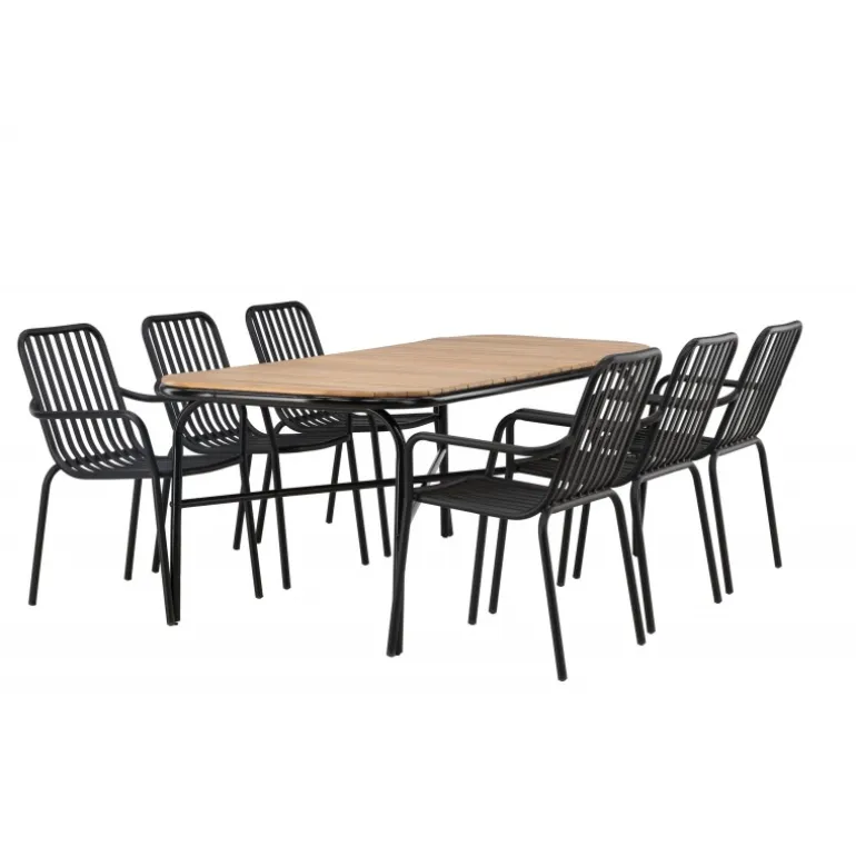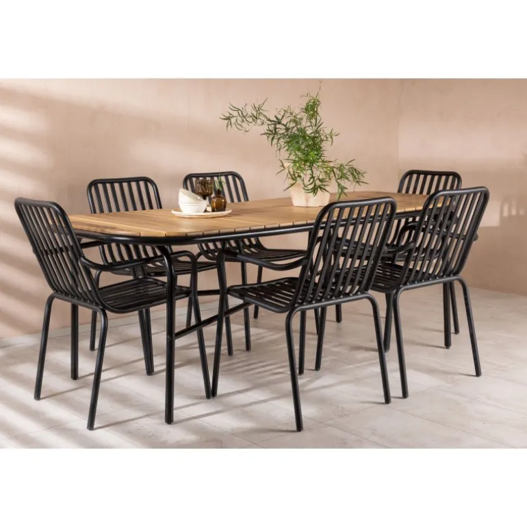 Velkommen hjem til en stilfuld Loungesæt – Havemøbelsæt med alle charmerende træk! Den populære Holmbeck spisebord har en rektangulær bordplade i elegant akacietræ med afrundede kanter og en minimalistisk base i sort stål. Her i perfekt kombination med sorte spisebordsstole fra Beijing serien. Stolens ribbede design og sodsorte farve får den til at føles både moderne og tidløs. Lavet af aluminium, hvilket gør den let at flytte rundt, og har integrerede armlæn for ekstra komfort. Lad tiden her være dagens højdepunkt! Bordmål: 200x90x75cm.