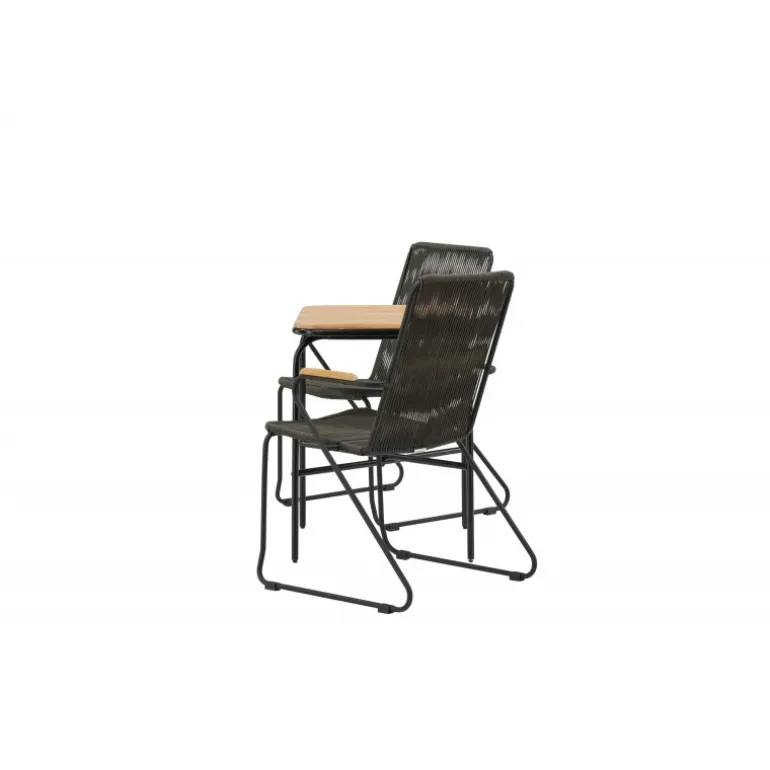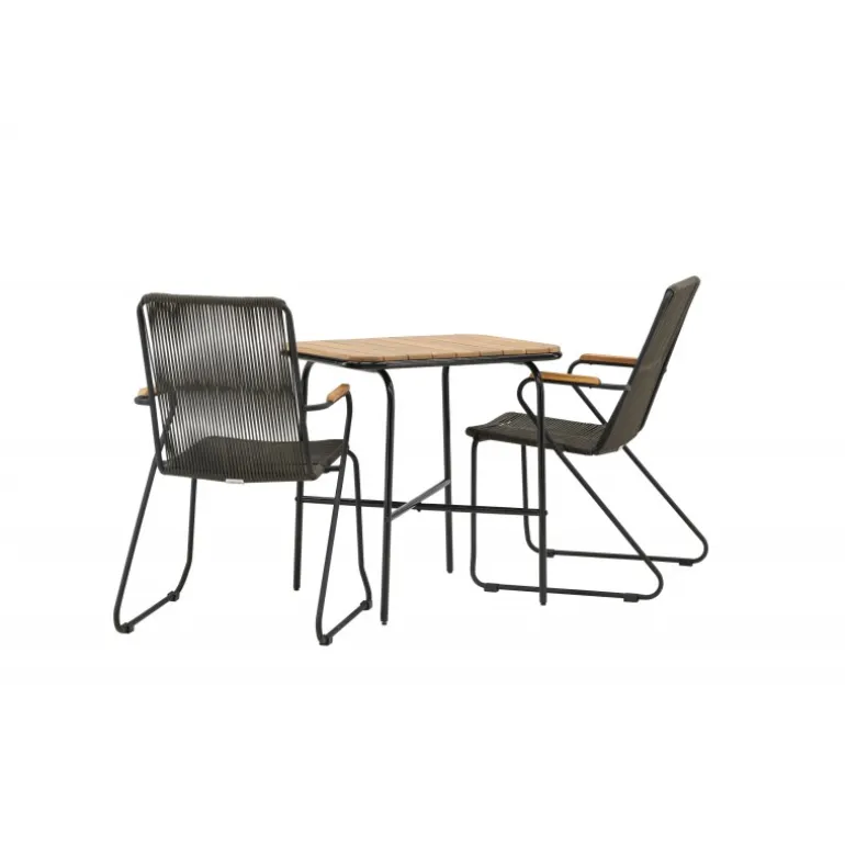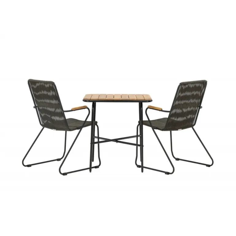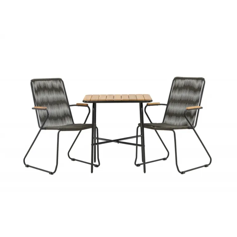 En hyggelig og charmerende cafégruppe til den lille balkon eller terrasse! Vores stilfulde cafébord Holmbeck har en moderne, ribbet bordplade i akacietræ og en minimalistisk base i sort stål. Her sammen med 2 grå spisebordsstole fra serien Bois. Stolen har et sæde i holdbart reb i en populær grå farve og en slank ramme i sort stål. Dæk bordet til kaffe og nyd et hyggeligt øjeblik udendørs! Bordmål: 74x70x55cm.