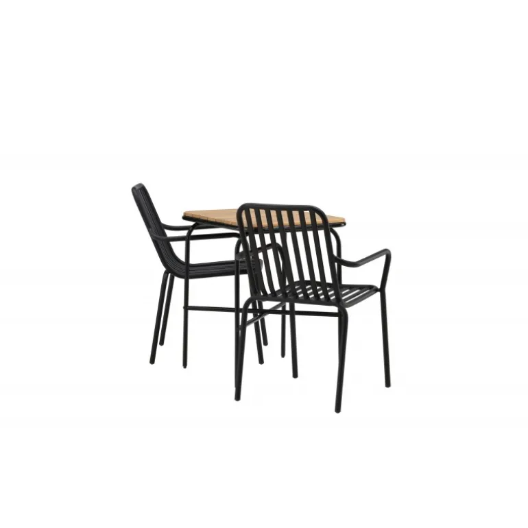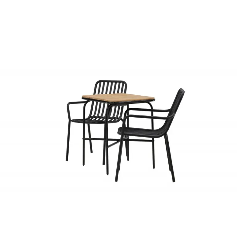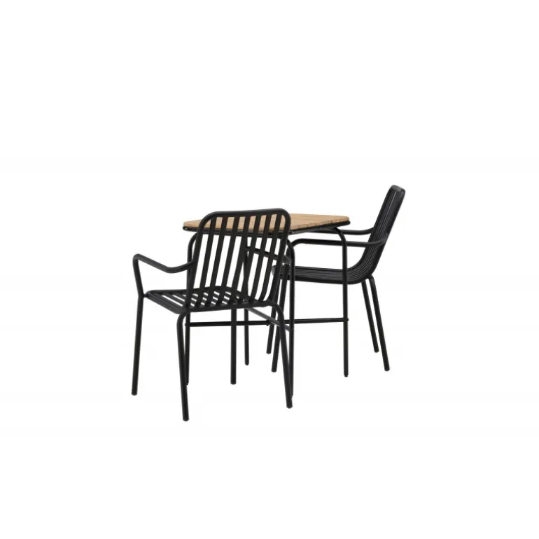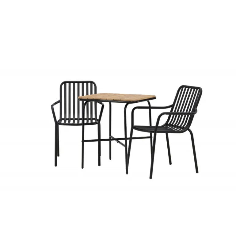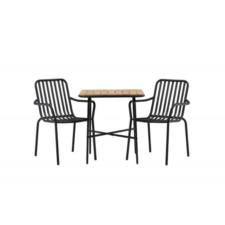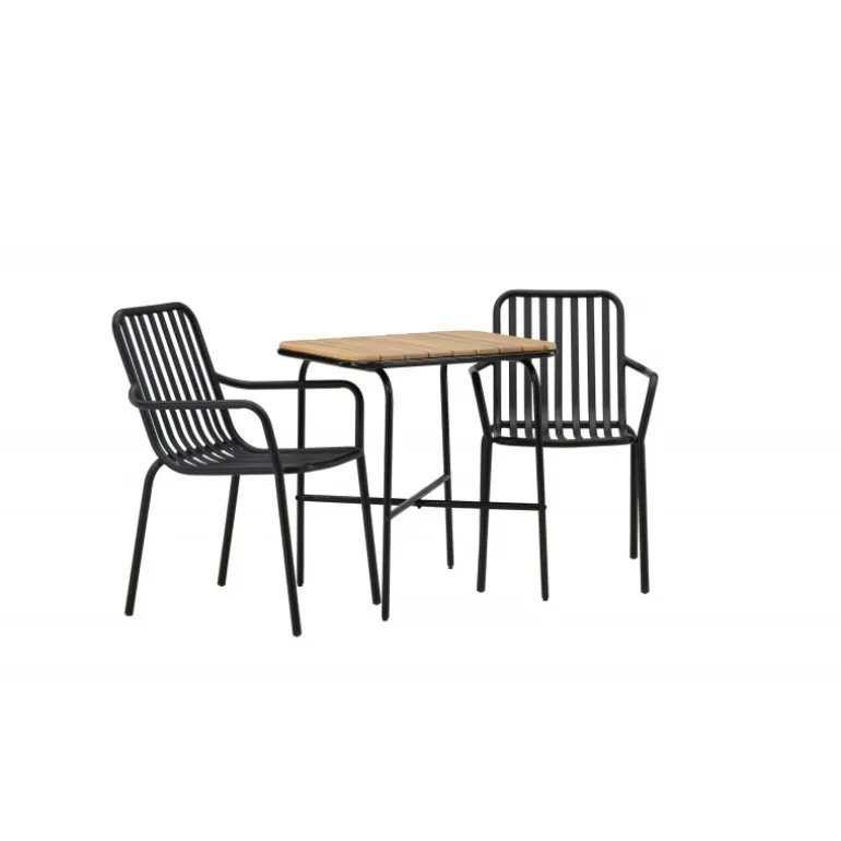 En drømmekombination af moderne og tidløst! Vores stilfulde cafébord Holmbeck har en moderne, ribbet bordplade i akacietræ og en minimalistisk base i sort stål. Her sammen med 2 sorte spisebordsstole fra serien Beijing. Stolen har også et ribbet design, og den sodsorte farve passer perfekt til bordet. Fremstillet af aluminium, hvilket gør den nem at flytte rundt og har også integrerede armlæn for ekstra komfort. Nyd eftermiddagskaffen udenfor denne sommer! Bordmål: 74x70x55 cm.