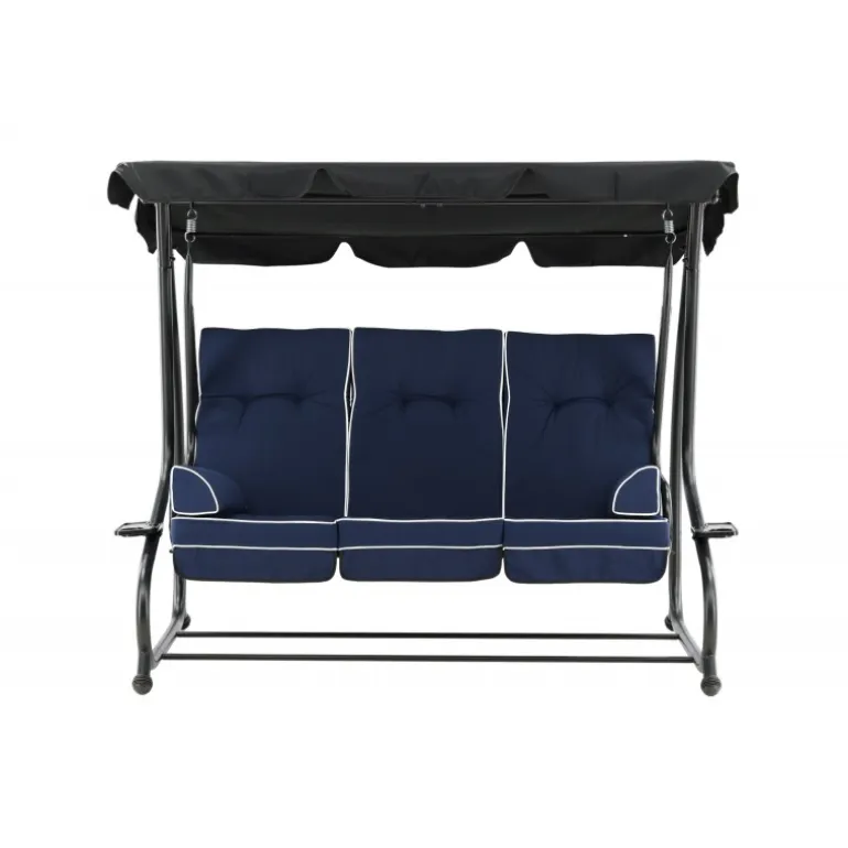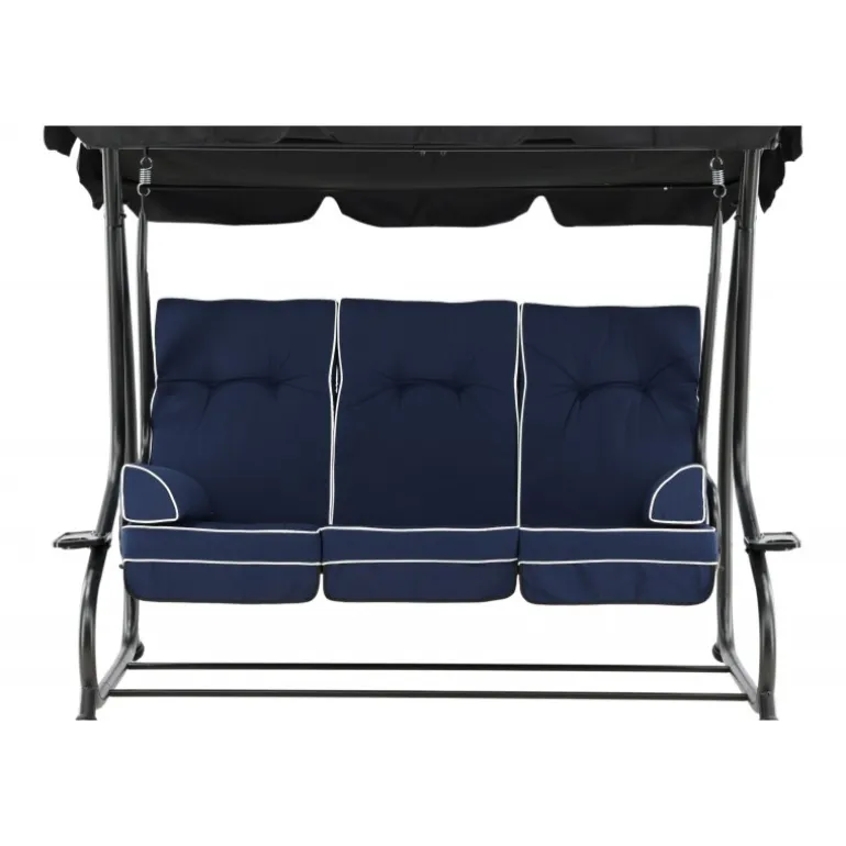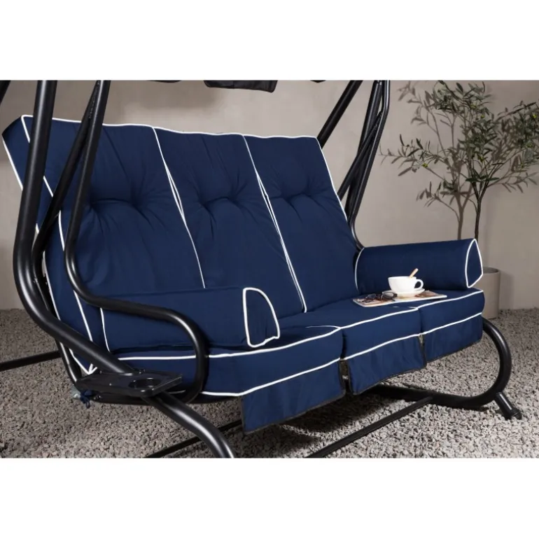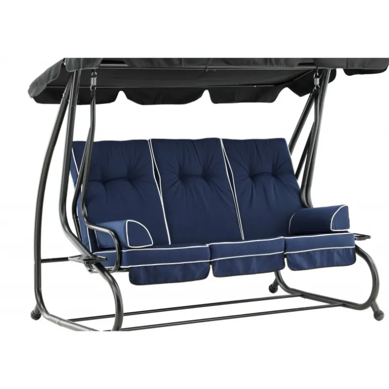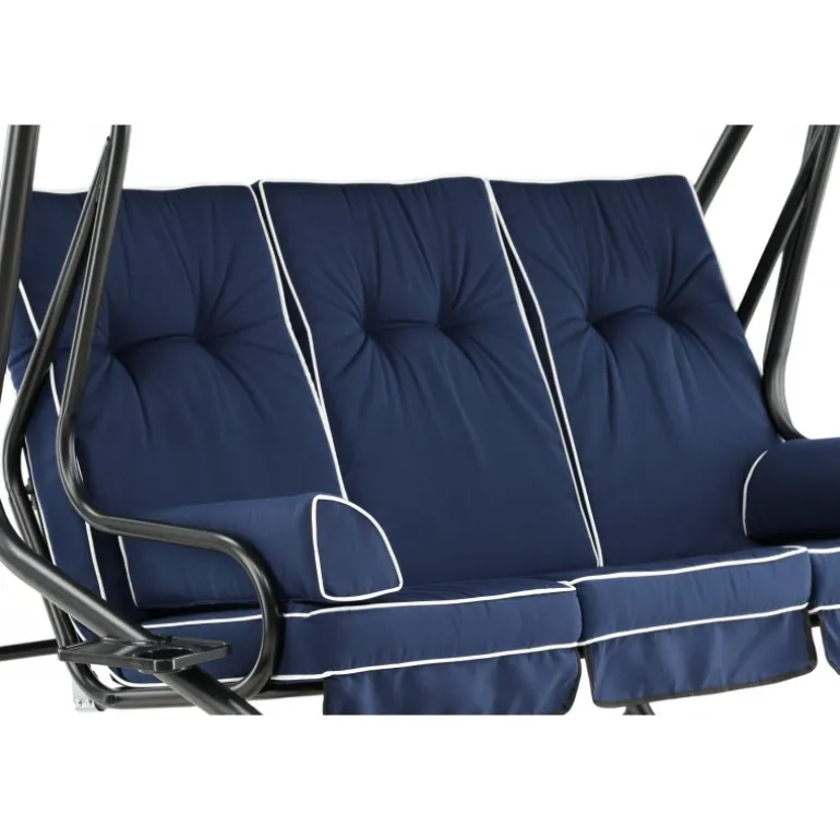 Blåt hyndesæt med 5-positioners pude og nakkepude samt stropper, der holder hynden på plads. Sid komfortabelt i mange timer. Fremstillet af skum og polyester, hvilket sikrer både komfort og holdbarhed. Perfekt til udendørs brug, men bør opbevares indendørs, når det ikke er i brug for at undgå skader og mug.