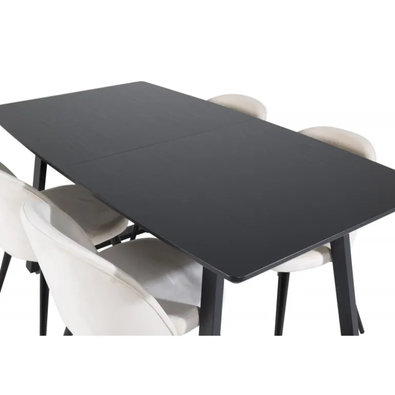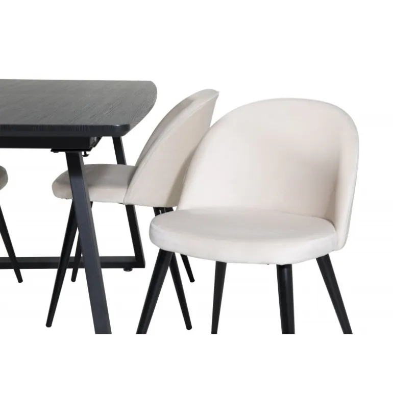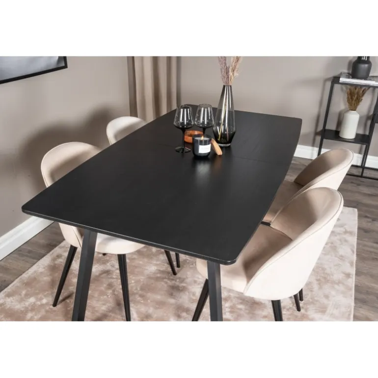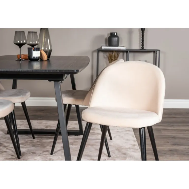 - Farvekombination: Elegant sort bord og beige stole, der passer til enhver indretning.