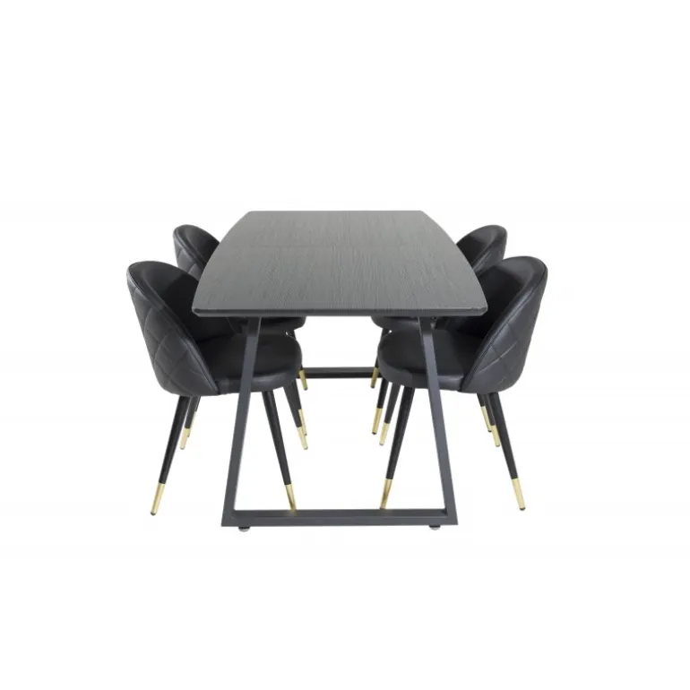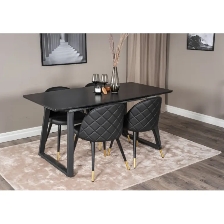 Klassisk madgruppe, der passer i de fleste husholdninger! Spisebordet Inca sammen med stole i Velvet-serien er som skabt til dem, der ønsker at skabe en hyggelig og moderne følelse i hjemmet. Inca Rektangulært Spisestuemøbel kombinerer elegant design med funktionalitet. Med sin sorte farve og materialer af høj kvalitet, er dette sæt både stilfuldt og holdbart. Det er ideelt til både daglig brug og særlige lejligheder.