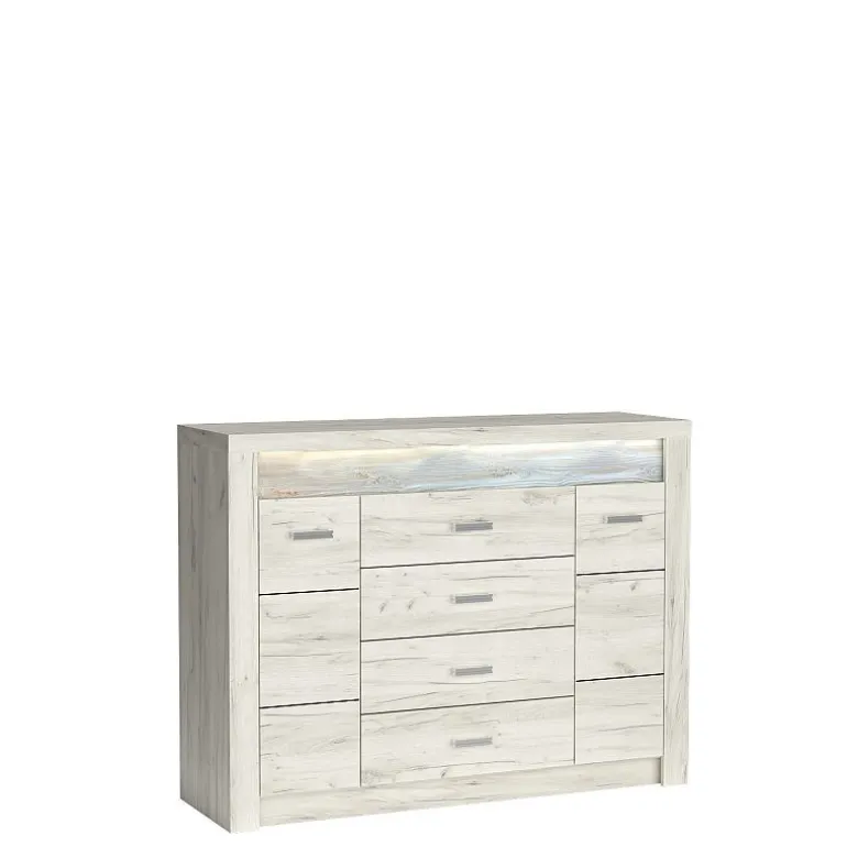 Opdag den stilfulde og funktionelle INDIANAPOLIS kommode I7 kratf hvid. Med dens moderne design og rummelige opbevaringsløsninger er denne kommode den perfekte tilføjelse til ethvert hjem. Fremstillet af højkvalitets laminerede spånplader og ABS finer, sikrer den både holdbarhed og elegance. Mulighed for at bestille LED-belysning separat for at tilføje et ekstra touch af luksus.