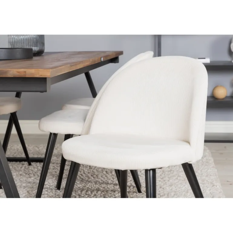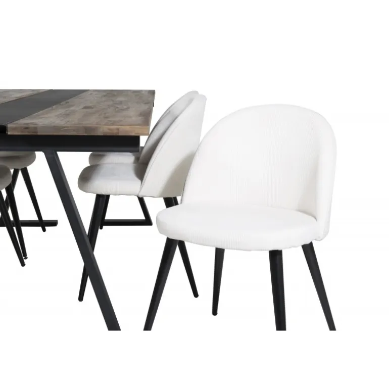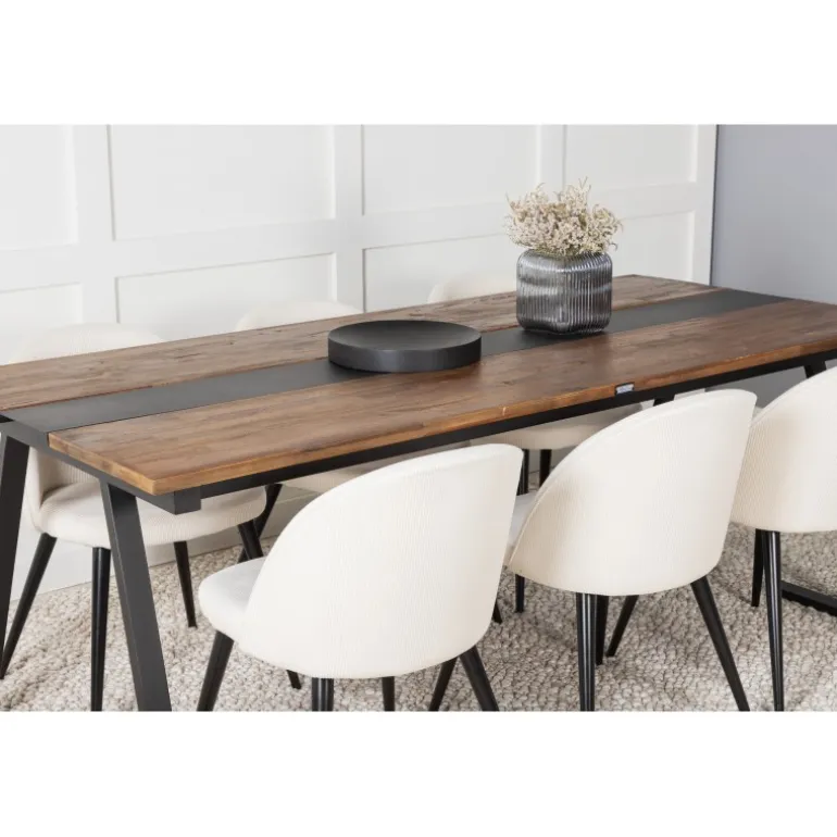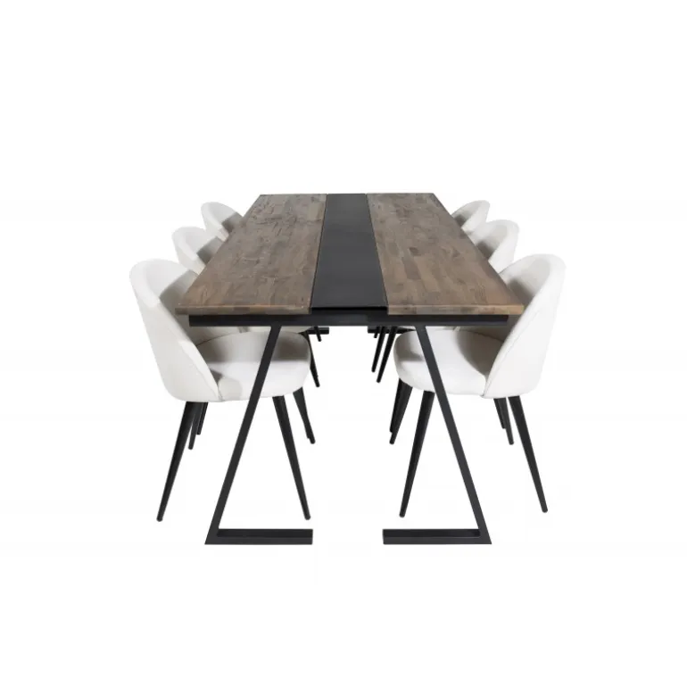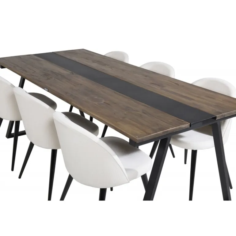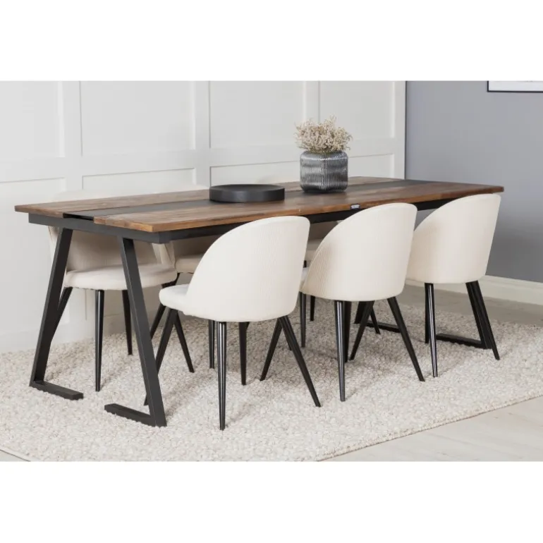 Hvem elsker ikke kombinationen af lys og frisk til lækkert rustikt træ? Spisebordet Jakarta og spisestolene Velvet er den perfekte kombination til hjertet af hjemmet. Med sit varme og hjemlige design bliver det hurtigt en flot indretningsdekoration. Spisebordsæt Jakarta er lavet af førsteklasses materialer som teak, stål og skum, hvilket sikrer både holdbarhed og komfort. Uanset om du holder en festmiddag eller en hyggelig familiemiddag, vil dette møbelsæt være midtpunktet i din spisestue.