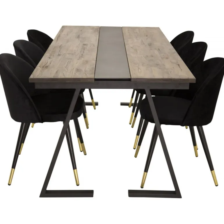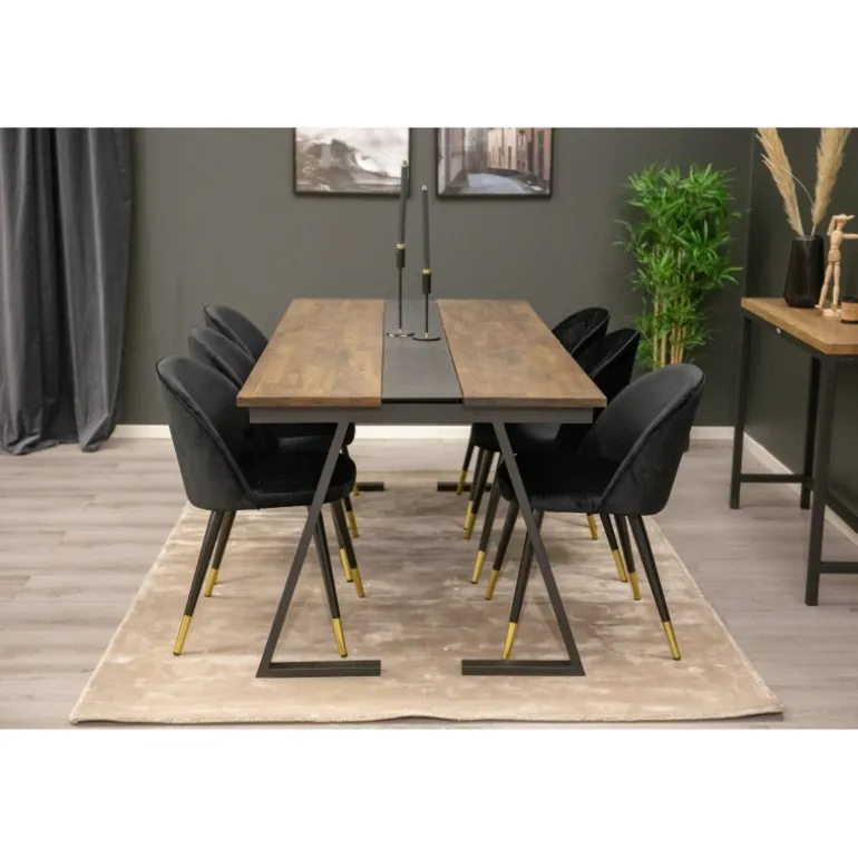 Spisebordet Jakarta i et industrielt look sammen med pompøse velourstole forbedrer indtrykket i enhver spisestue. Elegant og hyggeligt! Med teaktræsbordplade og stålben kombinerer dette sæt robusthed og stil. De sorte og gyldne stole tilføjer et luksuriøst præg, hvilket gør det til et ideelt valg for moderne hjem.