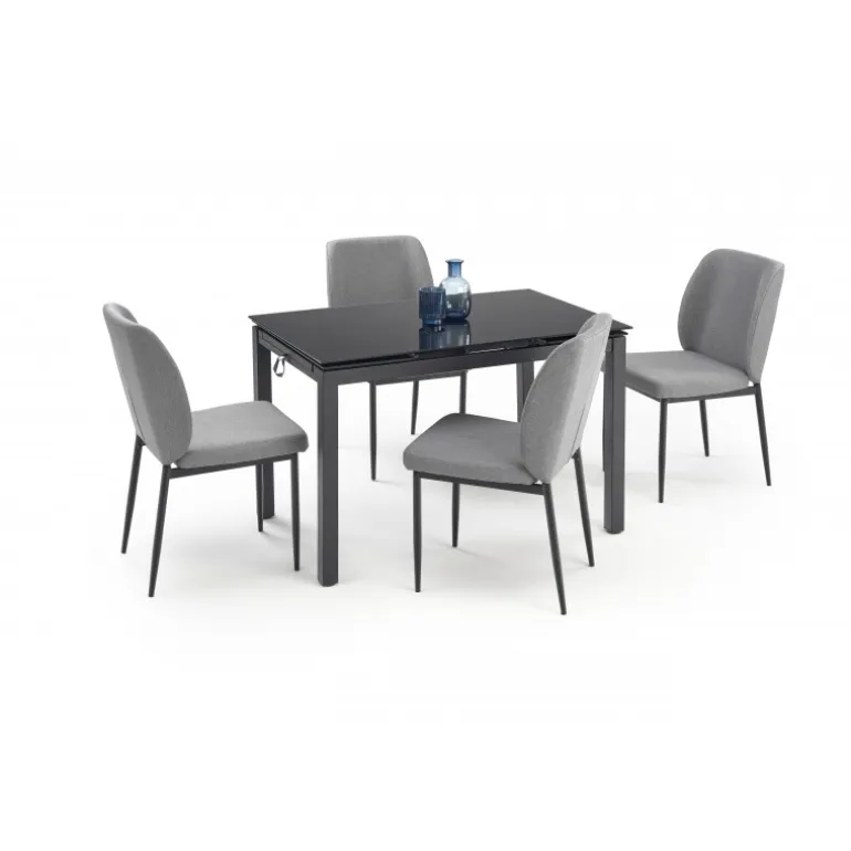 JASPER sæt bord + 4 Spisebordsstole er det perfekte valg til din spisestue. Dette elegante spisesæt kombinerer moderne design med funktionalitet. Bordet er justerbart, hvilket gør det ideelt til både små og store sammenkomster. Spisebordsstolene er komfortable og stilfulde, lavet af holdbare materialer som glas og pulverlakeret stål. Med sin Sorte og grå farve passer dette sæt ind i ethvert hjem og giver et sofistikeret touch til din indretning.