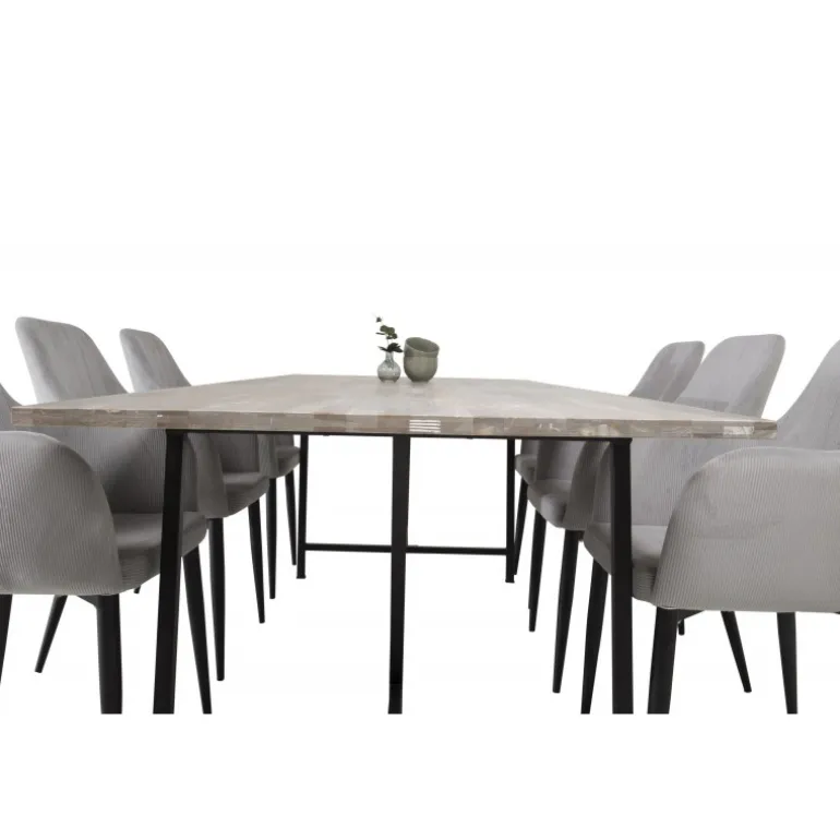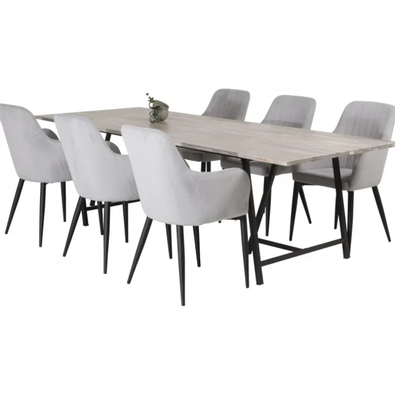 Jepara Rektangulær Spisebordssæt kombinerer forskellige farver og materialer på en måde, der skaber en moderne, hyggelig og tidløs atmosfære. Med vores spisebord Jepara og spisestole Comfort får du en perfekt kombination af stil og komfort, der passer ind i ethvert hjem. Bordpladen i teaktræ tilføjer et naturligt og elegant touch, mens de lette grå stole med polyesterfløjl sikrer optimal siddekomfort. Dette sæt er ideelt til familiesammenkomster og hyggelige middage.