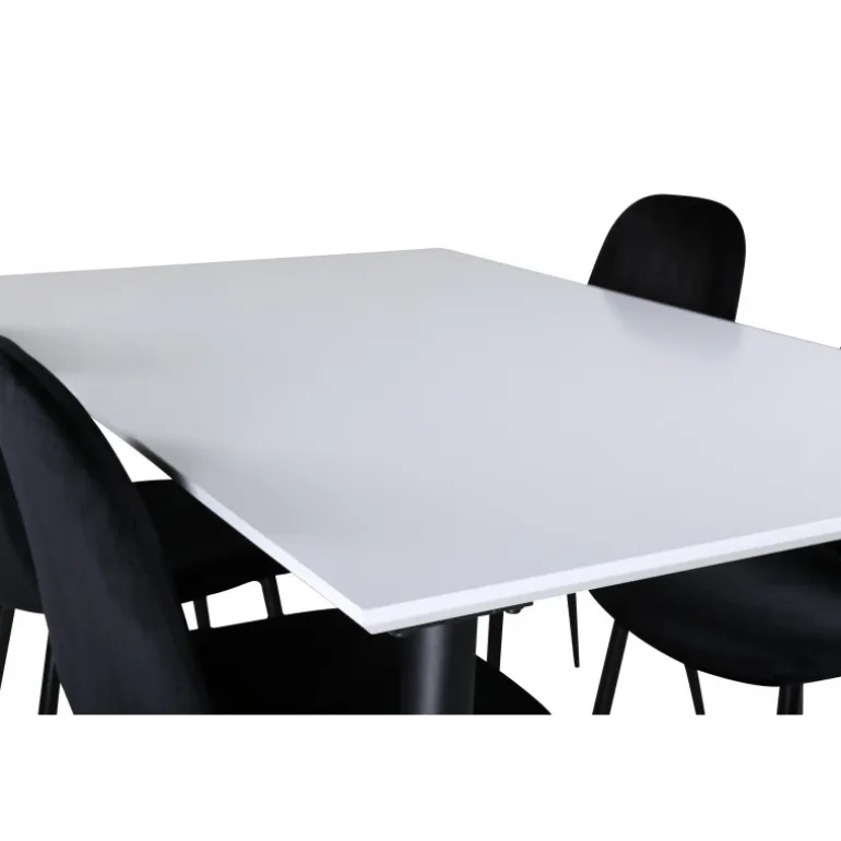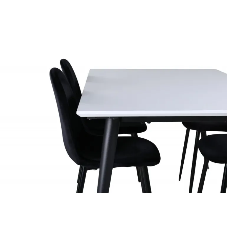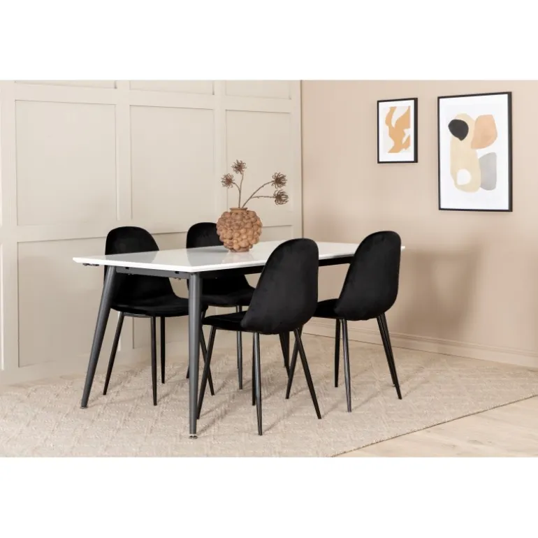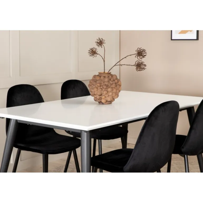 Med det klassiske og moderne spisebord Jimmy i skandinavisk design kan hele familien samles til middag og socialt samvær. Bordet er udtrækkeligt og har en hvid bordplade i HPL og MDF samt sorte, let skrånende bordben i jern. Bordets dimensioner: Længde udtrækkelig mellem 150cm og 240cm, bredde: 90cm, højde: 76cm. Her sammen med vores komfortable spisestole Polar med blød velour sæde og stel i sort metal. Stolens dimensioner: Højde: 88cm, sædehøjde: 41,5cm, bredde: 42,5cm, dybde: 53,3cm. Lad tiden ved spisebordet blive et af dagens højdepunkter!