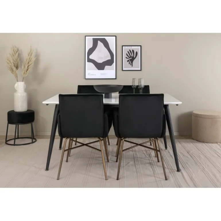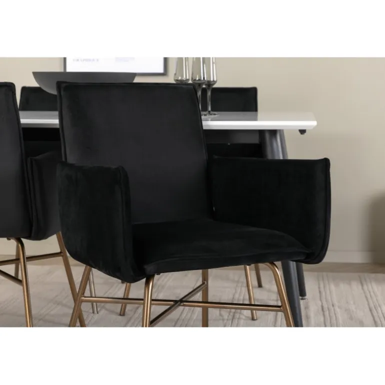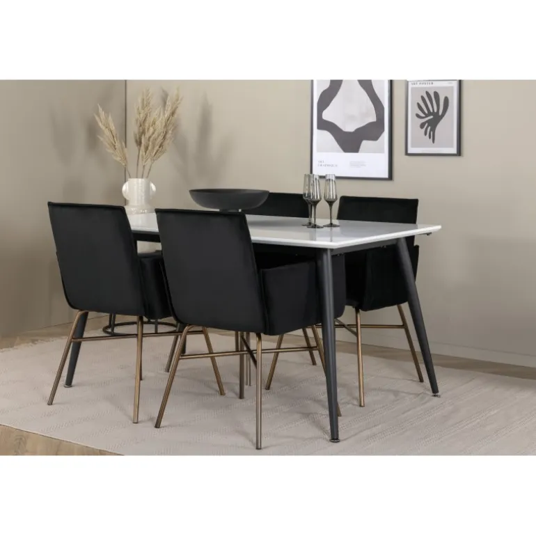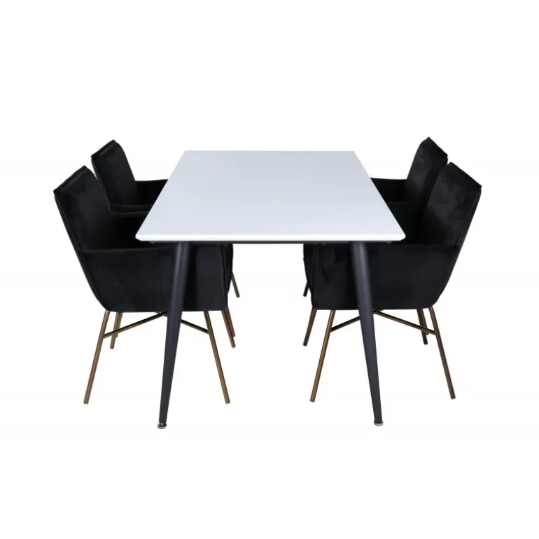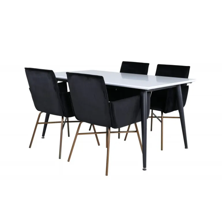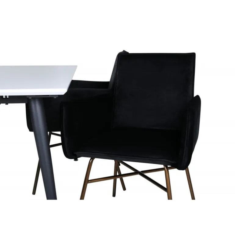 Klassisk, stilfuld og praktisk – Jimmy spisestuesæt er et sikkert valg til alle lejligheder! Med en udtrækkelig topplade i hvid HPL og MDF finer samt let skrånende ben i sort metal, passer dette bord perfekt til alle indretningsstile og hjem. Bordmål: Længde udtrækkelig mellem: 150 cm og 240 cm, Bredde: 90 cm, Højde: 76 cm. Matchet her med 6 Petra spisebordsstole i luksuriøst design. Den indbydende sæde er i sort fløjlstof, og stolbenene er dekorative i kobberfarvet jern. Stolemål: Højde: 87 cm, Sædehøjde: 48 cm, Bredde: 57 cm, Dybde: 60 cm. Her sidder du og dine gæster komfortabelt i timevis!