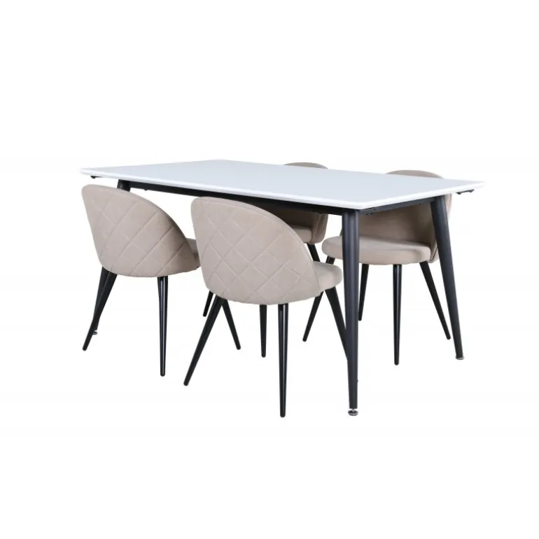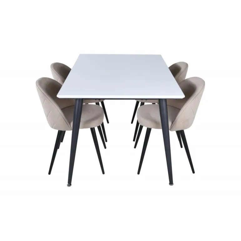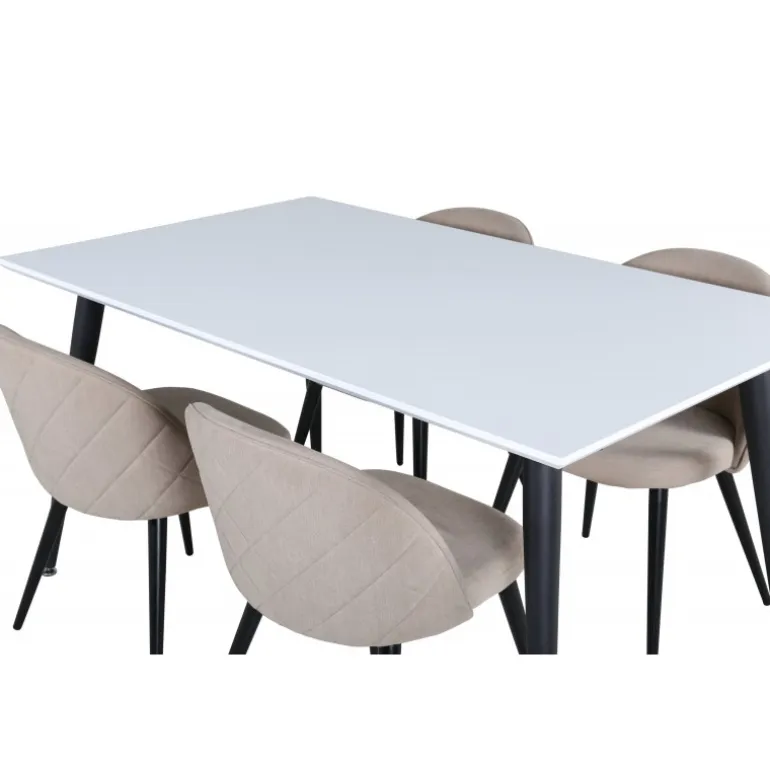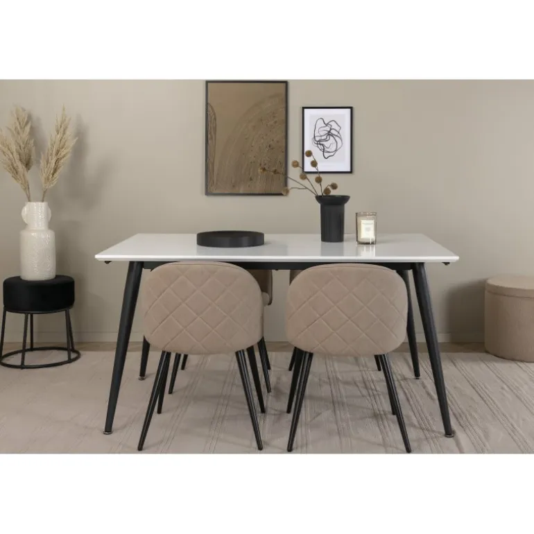 Skab en hjemlig og indbydende atmosfære i hjertet af dit hjem! Jimmy spisebord er et sikkert valg til alle anledninger. Med en udtrækkelig topplade i hvid HPL og MDF finer samt let udadgående ben i sort metal, passer dette bord perfekt til alle indretningsstile og hjem. Bordets dimensioner: Længde kan udtrækkes mellem 150 cm og 240 cm, bredde: 90 cm, højde: 76 cm. Her i perfekt kombination med 4 af vores populære Velvet Stitches spisebordsstole. De sorte metalstoleben er udformet i skandinavisk design, og sæderne i beige polyesterlin har en flot dekorativ syning på stolens ryg. Stolens dimensioner: Højde: 76,5 cm, sædehøjde: 46,5 cm, bredde: 50 cm, dybde: 57 cm.