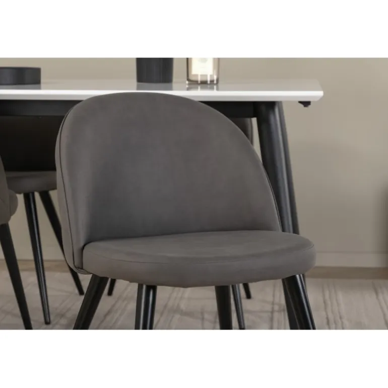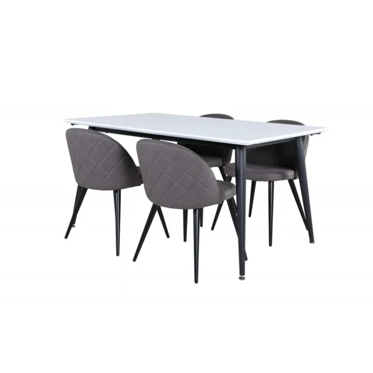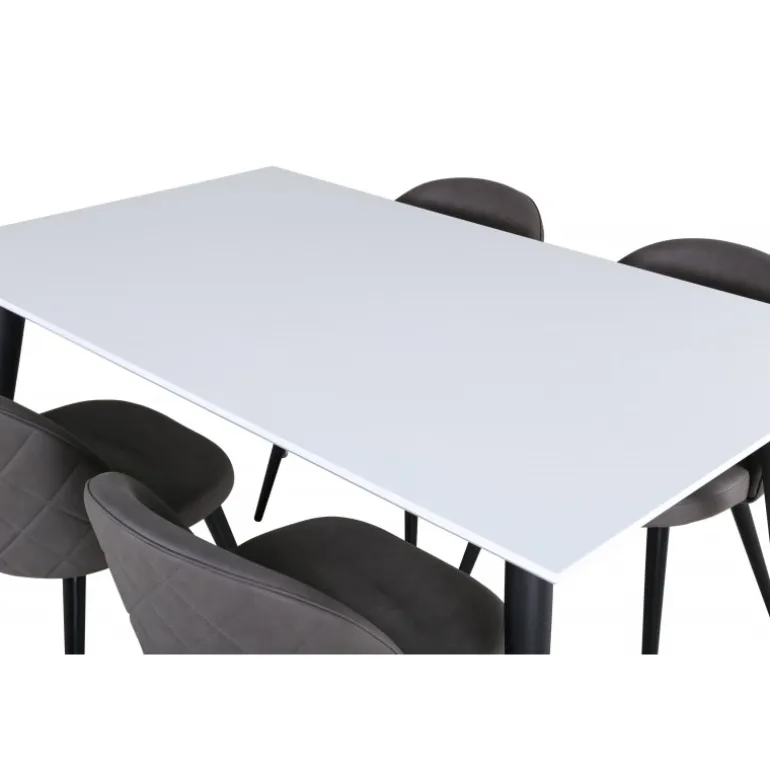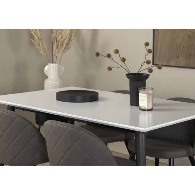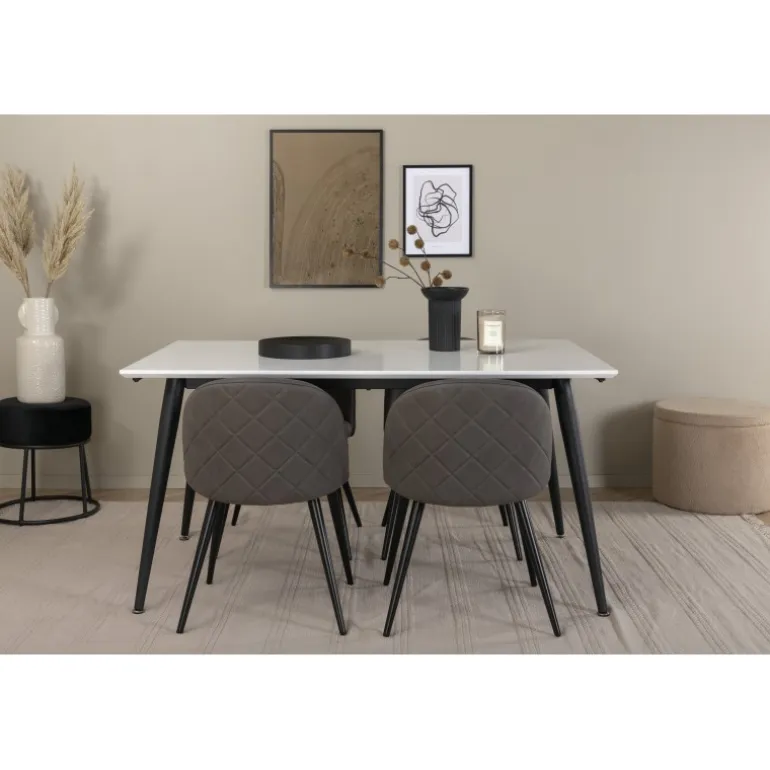 Skab en hjemlig og indbydende atmosfære i hjertet af dit hjem! Jimmy spisestuebord er et sikkert valg til alle lejligheder. Med en udtrækkelig topplade i hvid HPL og MDF finer samt let skrånende ben i sort metal passer dette bord perfekt til alle indretningsstile og hjem. Bordmål: Længde udtrækkelig mellem: 150cm og 240cm, bredde: 90cm, højde: 76cm. Her i perfekt kombination med 4 af vores populære Velvet Stitches spisestuestole. De sorte metalben på stolen er skrånende i skandinavisk design, og sæderne i grå mikrofiber har stilfulde dekorationssømme på ryggen. Stolens mål: Højde: 76,5cm, sædehøjde: 46,5cm, bredde: 50cm, dybde: 57cm.