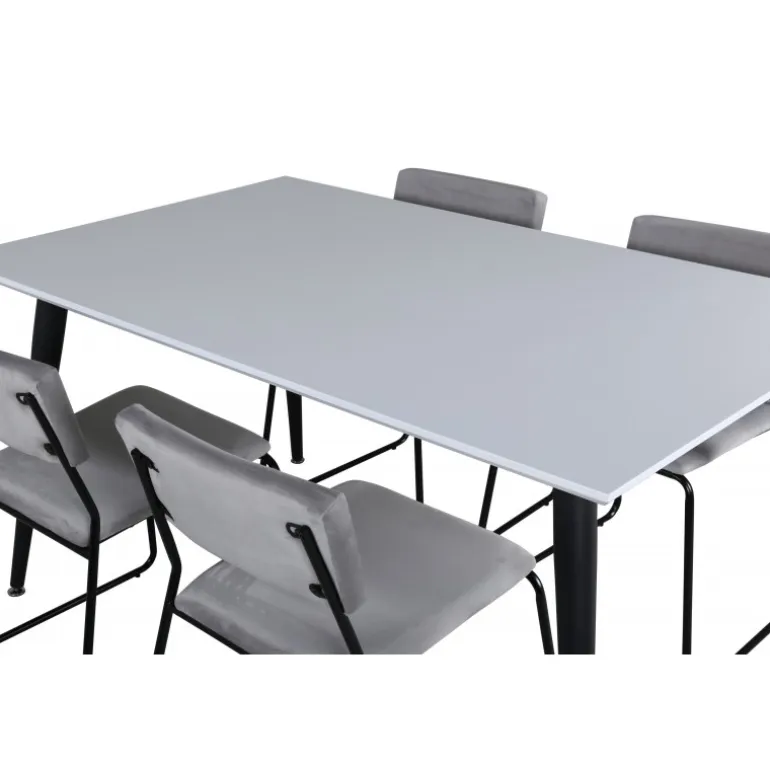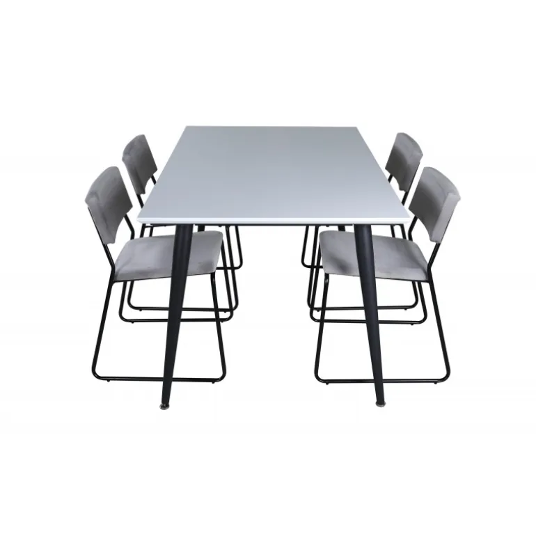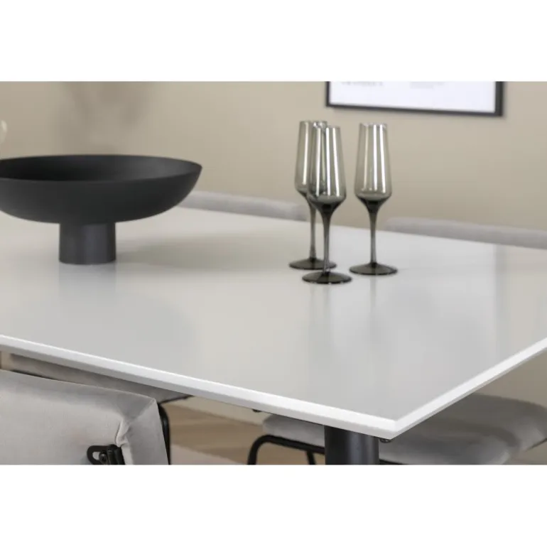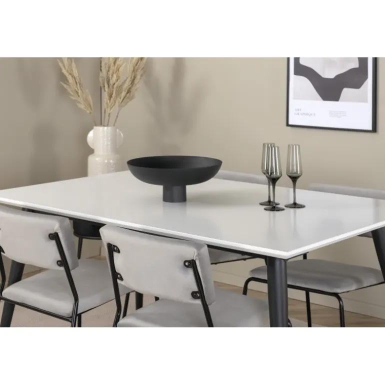 Minimalistisk og stilfuldt – et Spisebordssæt til alle anledninger! Jimmy spisebordet har en udtrækkelig bordplade i hvid HPL og MDF finer og let skrånende ben i sort metal, et klassisk look der gør dette bord perfekt til alle interiørstile og hjem. Bordets dimensioner: Længde udtrækkelig mellem: 150 cm og 240 cm, bredde: 90 cm, højde: 76 cm. Her sammen med 4 Kenth spisebordsstole i flot design. Stolens ben er stilfuldt smalle i sort jern, og sæderne er komfortable i grå fløjl. Stolens dimensioner: Højde: 76 cm, sædehøjde: 48,5 cm, bredde: 40 cm, dybde: 52 cm.