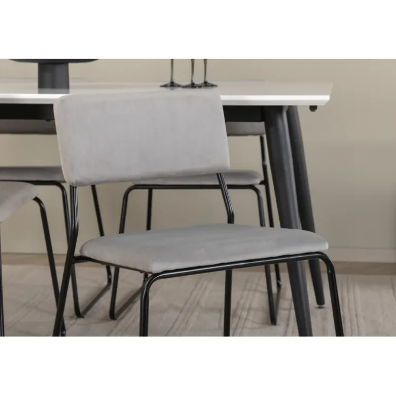 - Komfortable stole: Kenth spisebordsstole med grå fløjlsæder og smalle sorte jernben for en moderne stil.