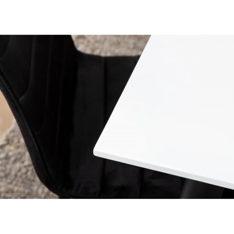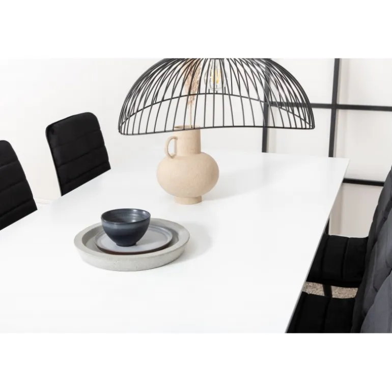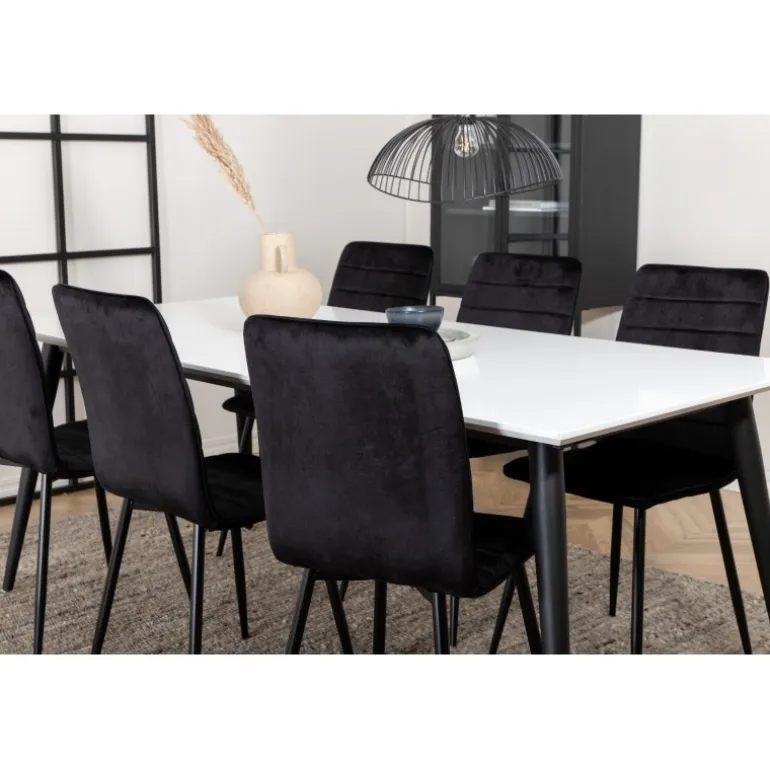 Vores klassiske og moderne spisebord fra Jimmy-serien i skandinavisk design, som hele familien kan samles omkring til middag og socialt samvær. Bordet er udtrækkeligt og har en hvid bordplade i HPL og MDF samt sorte, let udadbuede bordben i jern. Bordets dimensioner: Længde Udtrækkelig mellem: 195 cm og 285 cm, bredde: 90 cm, højde: 76 cm. Her i en lækker kombination med 6 Windu luksus spisebordsstole med sorte stolben i jern og sorte sæder af blødt velour stof. Stolens dimensioner: Højde: 94 cm, sædehøjde: 47 cm, bredde: 43 cm, dybde: 49 cm. Stolens høje siddekomfort inviterer til lange og vidunderlige øjeblikke for socialt samvær!