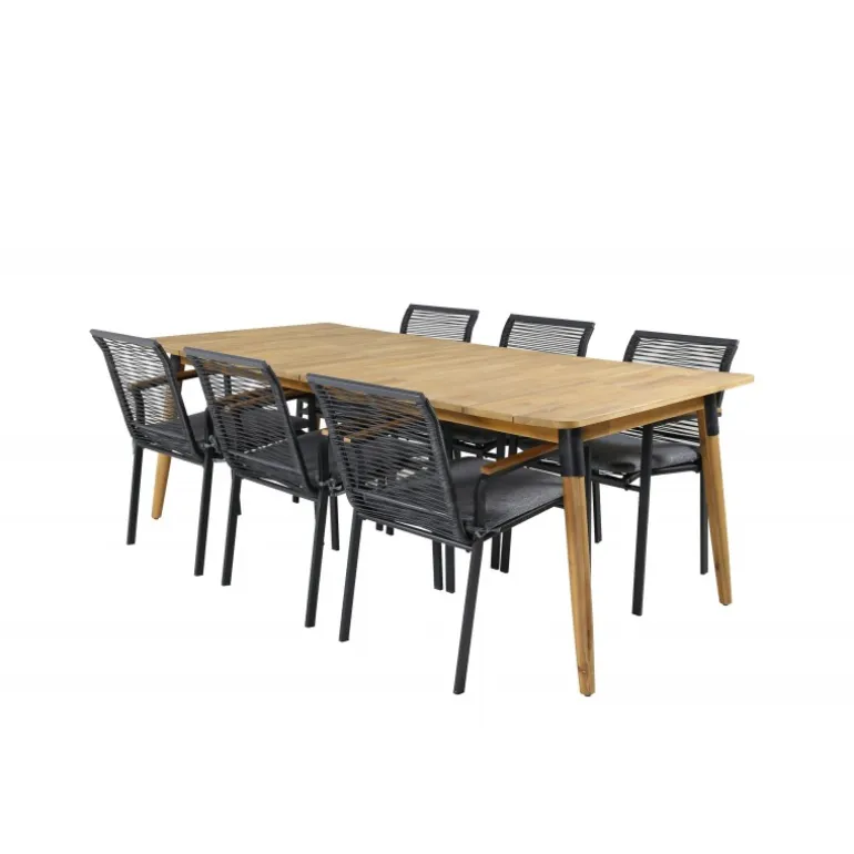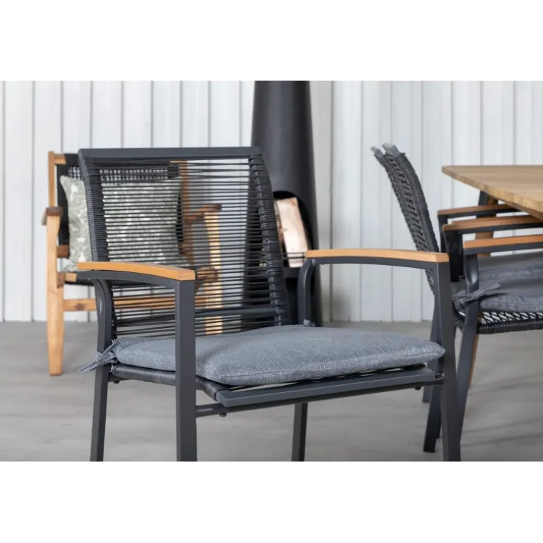 - Holdbart materiale: Bord i høj kvalitets akacietræ og stole i robust sort reb.