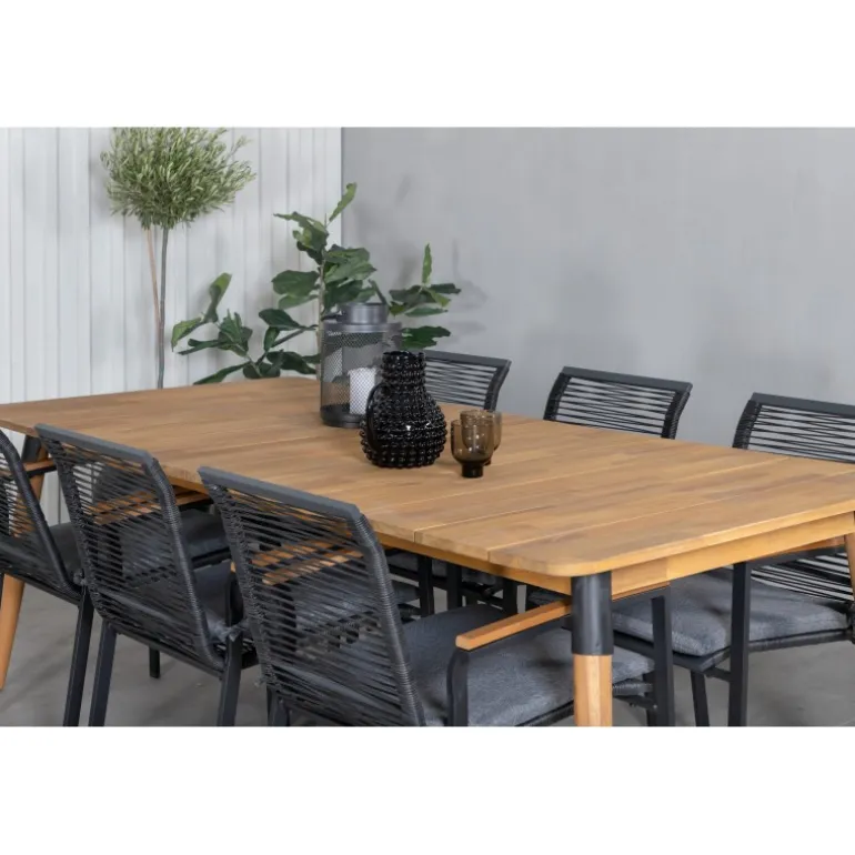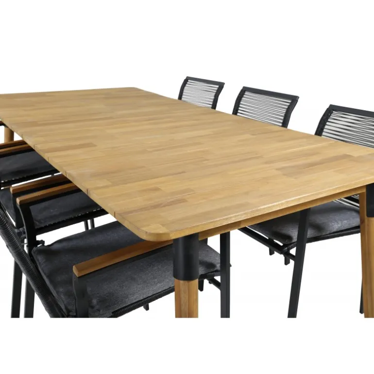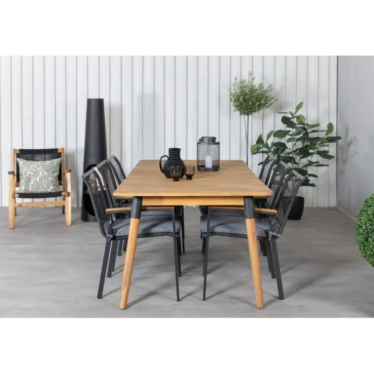 Nyd sommerens nætter med dette smarte og holdbare Loungesæt – Havemøbelsæt! Det rektangulære bord Julian i akacietræ kombineres med de stilfulde Dallas stole i sort reb. Skab en moderne og luksuriøs atmosfære i din udendørs plads med dette sæt, der har plads til mange gæster. Perfekt til både festlige anledninger og hyggelige måltider under åben himmel.