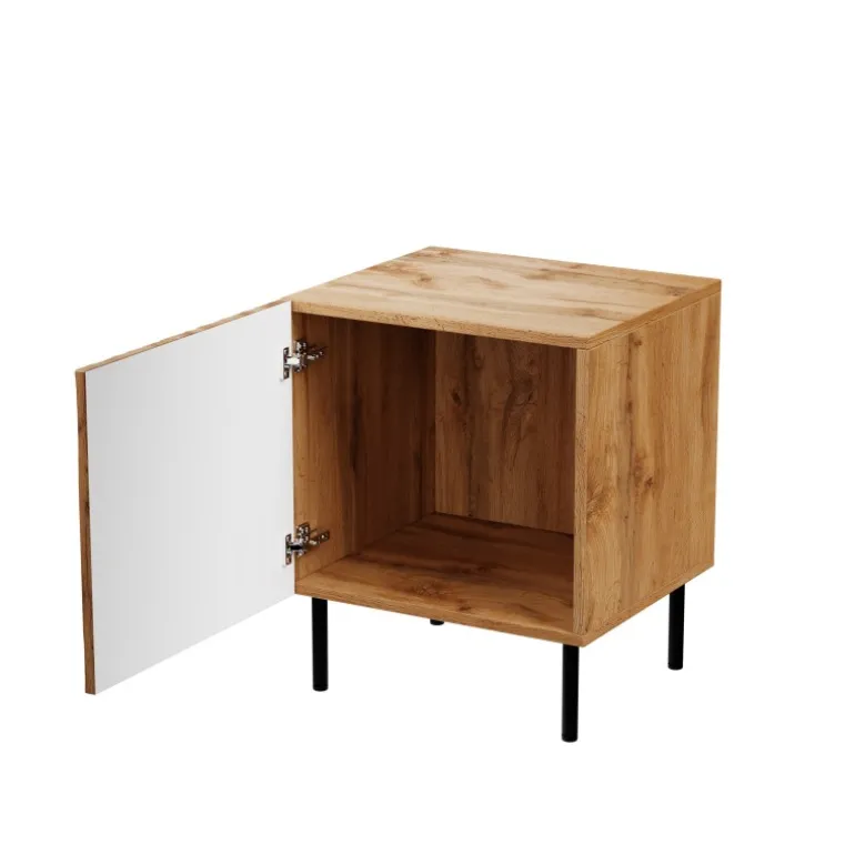 Oplev den perfekte kombination af stil og funktionalitet med JUNGLE natbordet. Dette sæt på 2 natborde er fremstillet af høj kvalitet materialer som mat lamineret spånplade og MDF-plade beklædt med folie, hvilket giver dem et elegant og moderne look. De synlige snit og wotan eg-kantning tilføjer en rustik charme, mens metalbenene sikrer holdbarhed. Med PUSH-CLICK systemet kan du nemt åbne og lukke skufferne uden håndtag. Perfekt til at tilføje et touch af sofistikation til dit soveværelse.