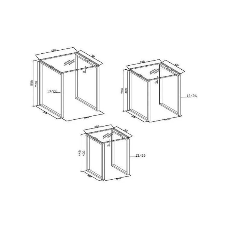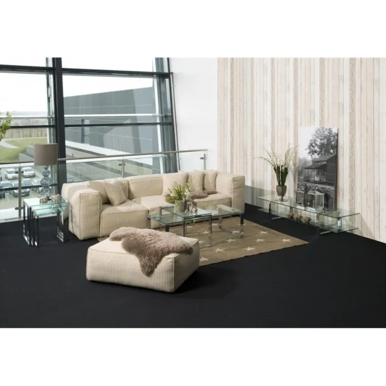 Sæt af 3 kvadratiske indskudsborde med glastoppe og stel i krombelagt metal. Bordene kan anvendes hver for sig eller sammen i forskellige kombinationsopstillinger.