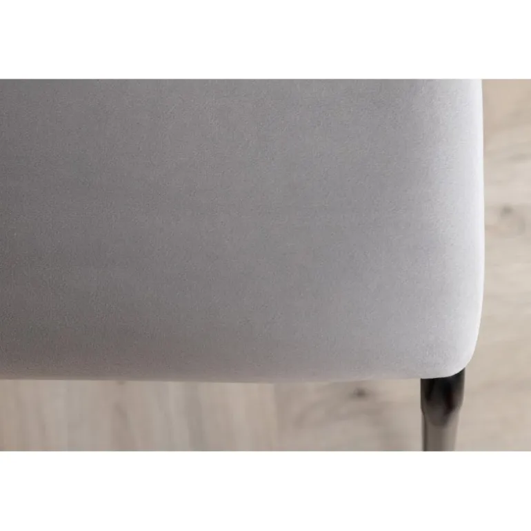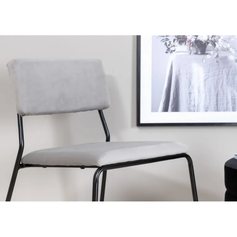 Skab et charmerende fokuspunkt i hjertet af dit hjem med elegante spisestole fra Kenth serien! Det minimalistiske, moderne design giver en luftig følelse til stuen eller køkkenet. Stolen har et ryglæn og sæde i lysegrå fløjl og polyesterblanding, med dekorativt slanke stoleben i sort jern. Nogle samlinger kræves. Fuldfør med et matchende bord og nyd hyggelige måltider sammen. Plejeinstruktioner: Fløjl har en tendens til at udvikle aftryk, når luven lægger sig ned. Disse aftryk kan få stoffet til at se slidt ud, hvilket er normalt for denne type materiale. Afhængig af hvordan lyset falder, kan stoffet fremstå i flere forskellige nuancer.