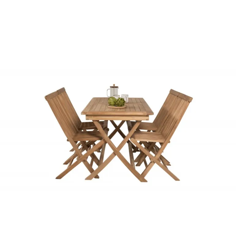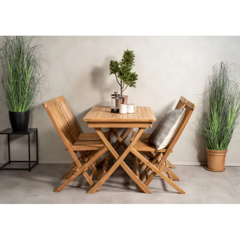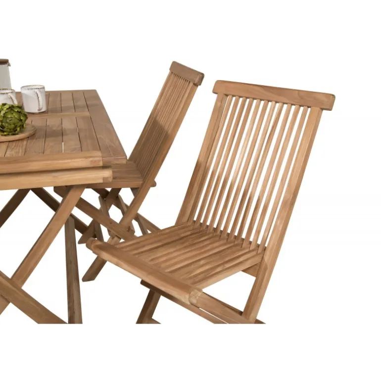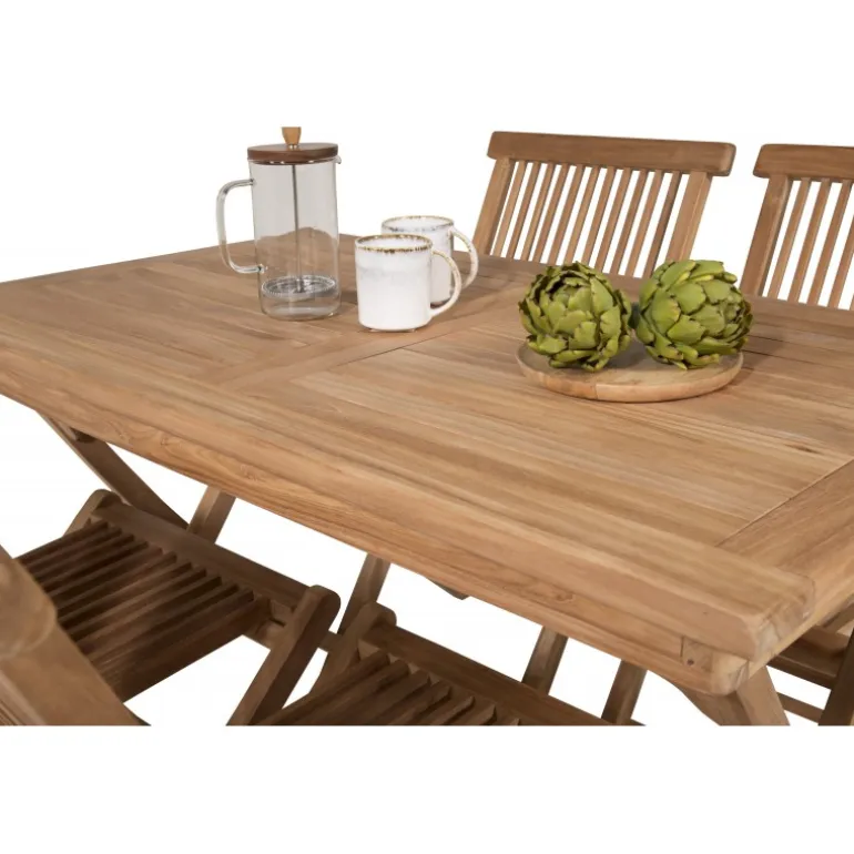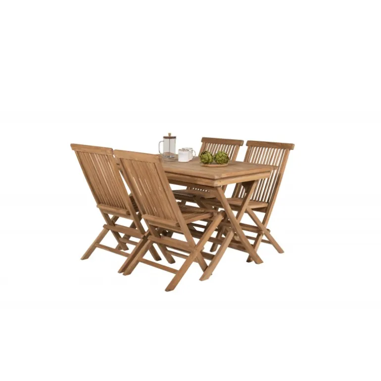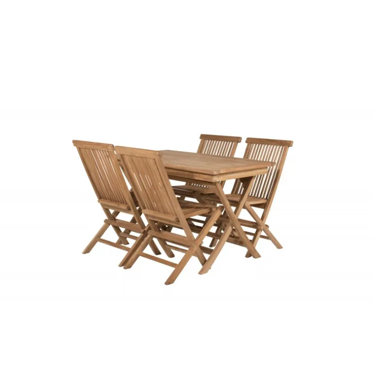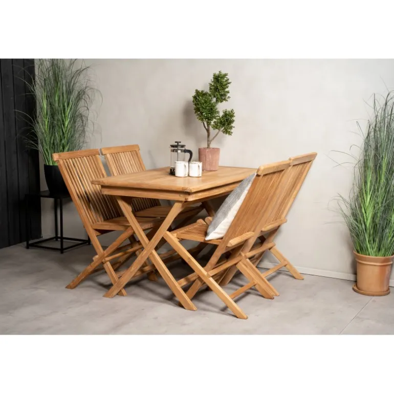 En trendfast Loungesæt – Havemøbelsæt i skandinavisk design! Vores populære, rektangulære spisebord Kenya har et tidløst design med ribbet version i smagfuld teak. Krydsbenene giver et stabilt og charmerende indtryk. Mål: 120×70 cm. Her i slank kombination med 4 lækre spisebordsstole fra samme serie. Stolene er også i teak og er sammenklappelige for praktisk opbevaring. Indret terrassen indbydende og skab et blikfang, der imponerer!