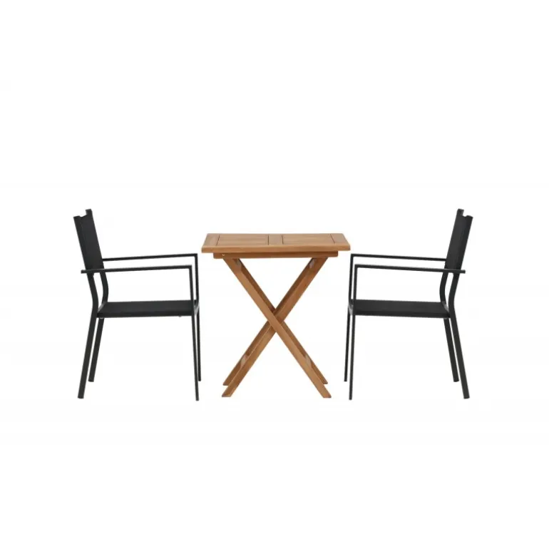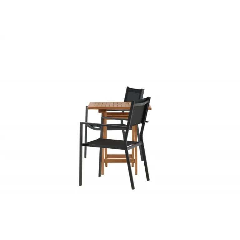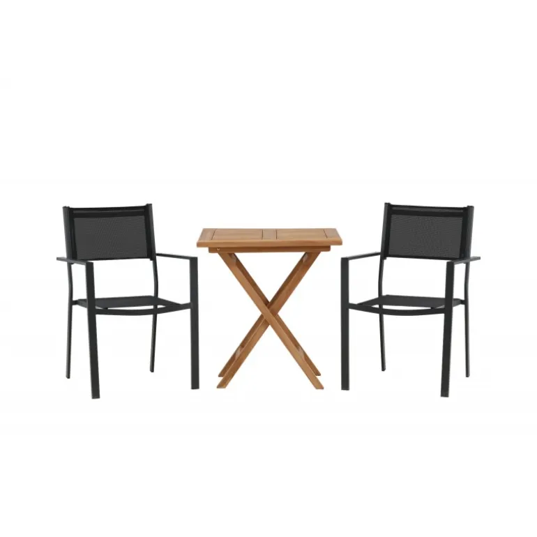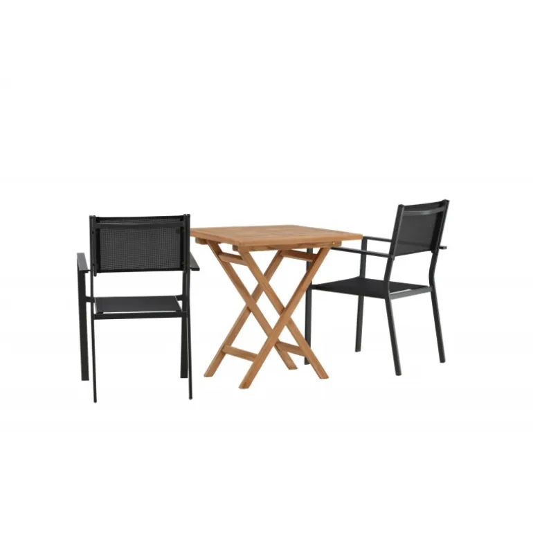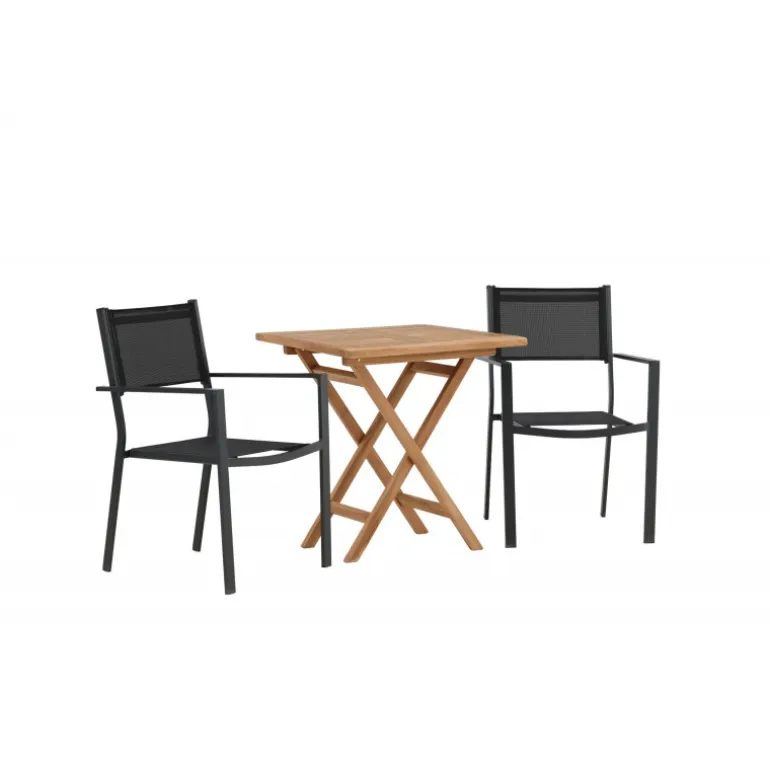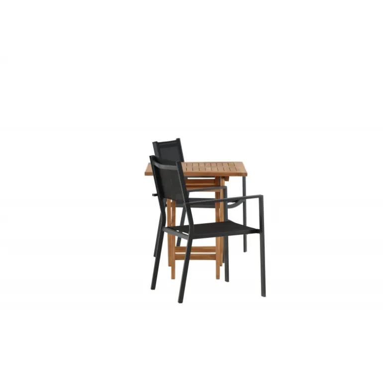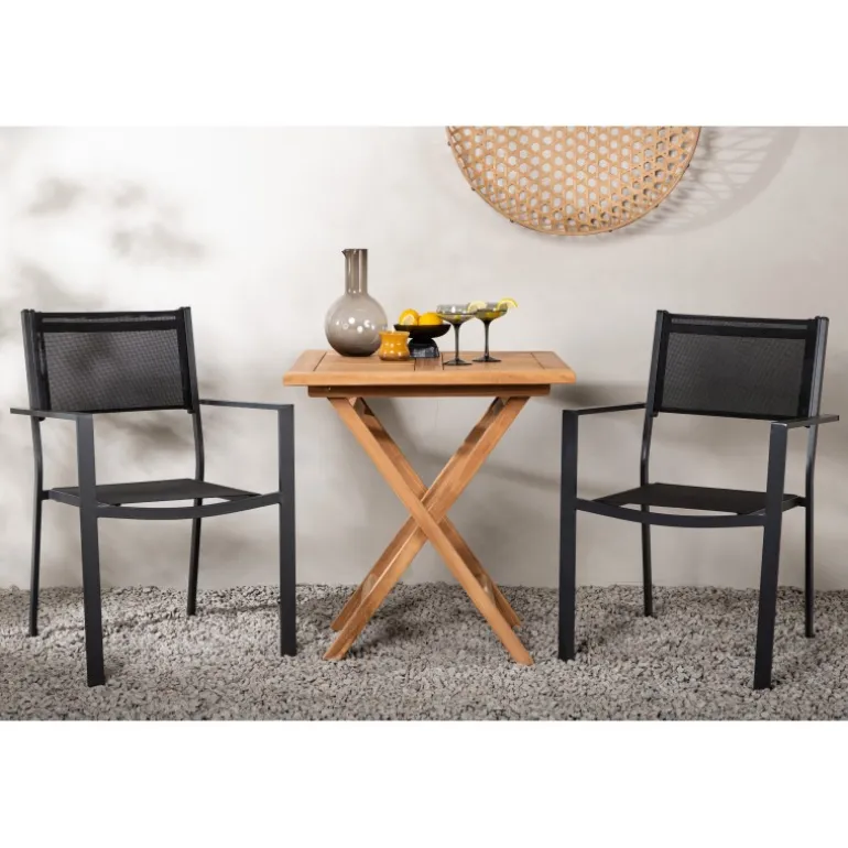 - Holdbare materialer: Bord i teaktræ og stole i aluminium og tekstil.