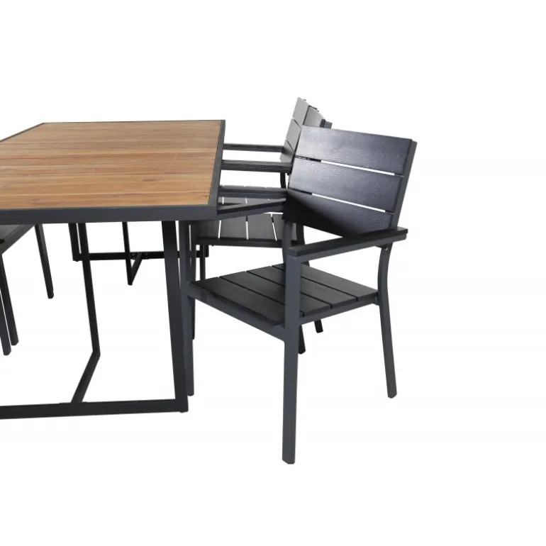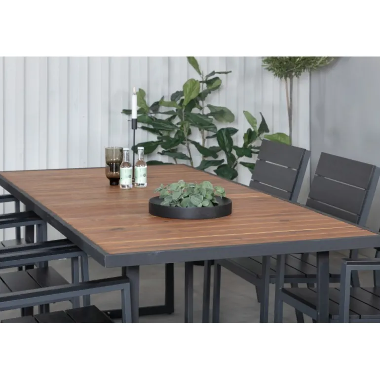 Oplev det perfekte udendørs Loungesæt – Havemøbelsæt med Khung Rektangulært Loungesæt – Havemøbelsæt. Dette moderne og stilfulde Loungesæt – Havemøbelsæt kombinerer Khung spisebord og Levels spiseborde, og skaber en indbydende atmosfære i din have. Spisebordet er lavet af holdbart akacietræ og stål, mens spisestolene er fremstillet af aintwood og aluminium. Med sin elegante naturfarve og sorte detaljer passer dette sæt perfekt til enhver udendørs indretning. Det kræver montering og kommer i 4 pakker.