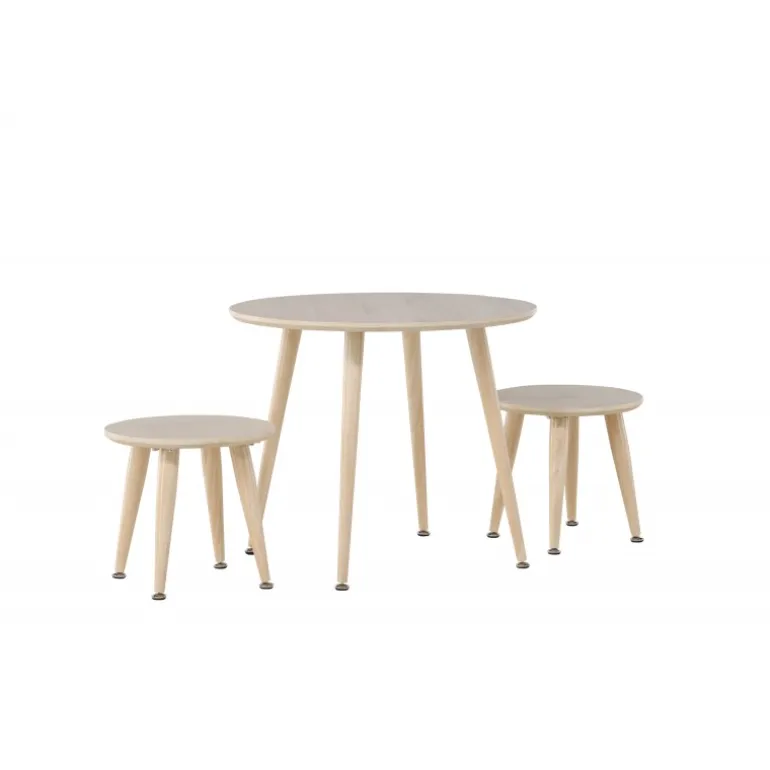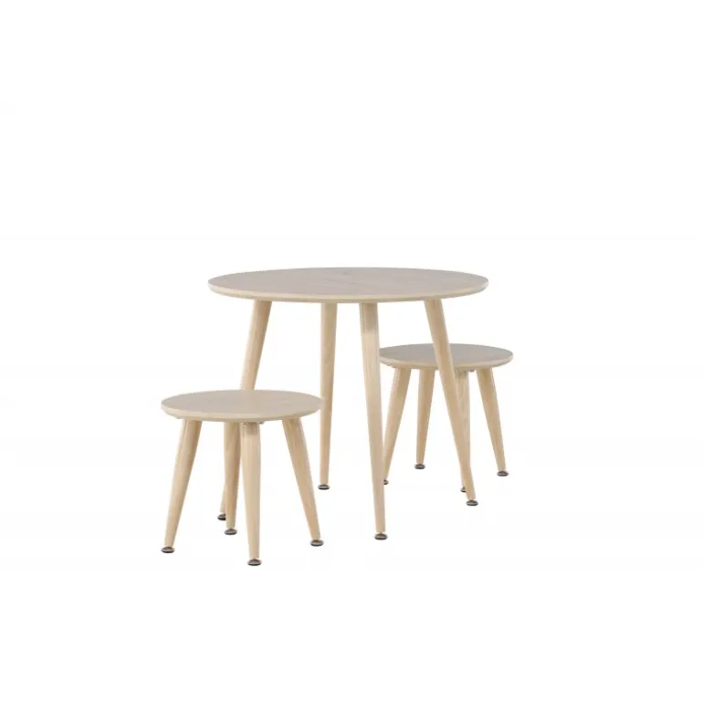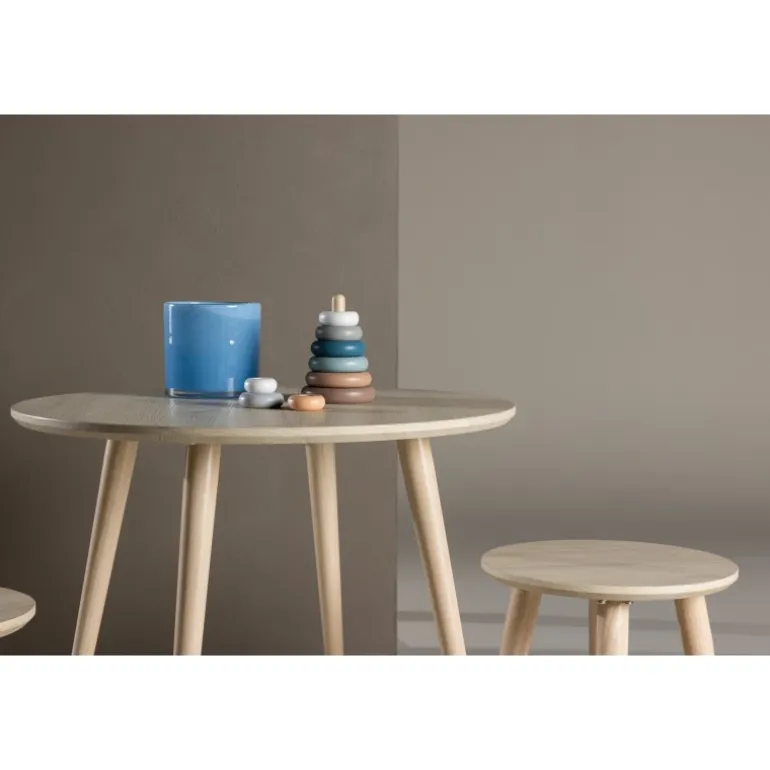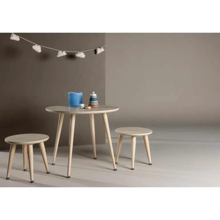 Oplev Kids børnebordssæt – det perfekte møbelsæt til børneværelset, der kombinerer stil og funktionalitet. Sættet består af to charmerende taburetter og et rundt bord, ideelt til at skabe en hyggelig og legende atmosfære, hvor børn kan samles og udforske. Kids sættet er designet i en elegant hvidvasket farve, der tilføjer et moderne touch til rummet, samtidig med at det skaber en varm og indbydende følelse. Bordet har en diameter på 60 cm, perfekt til leg og aktiviteter. Med sit trendy design og jordnære æstetik passer Kids sættet perfekt ind i forskellige børneværelsesstile og skaber et behageligt miljø for børn at nyde. Giv dit barns værelse et moderne touch og skab mindeværdige øjeblikke med Kids sættet – det ultimative valg til fællesskab og leg. Produktet er FSC® certificeret (FSC®C177288), hvilket betyder, at det består af træ fra ansvarligt forvaltede skove, der tager hensyn til mennesker og miljø.