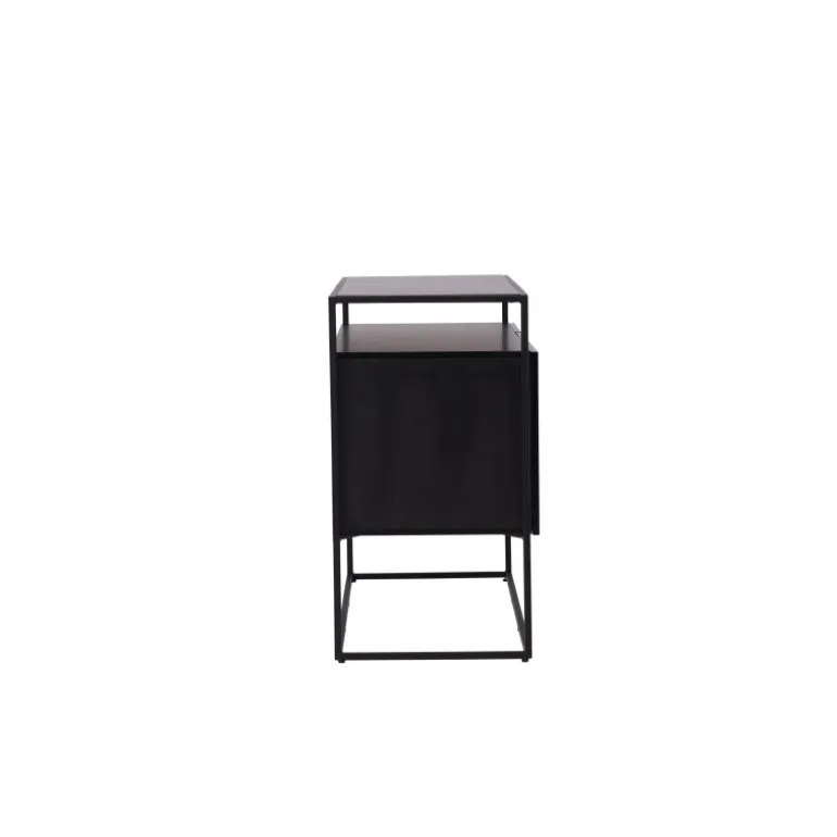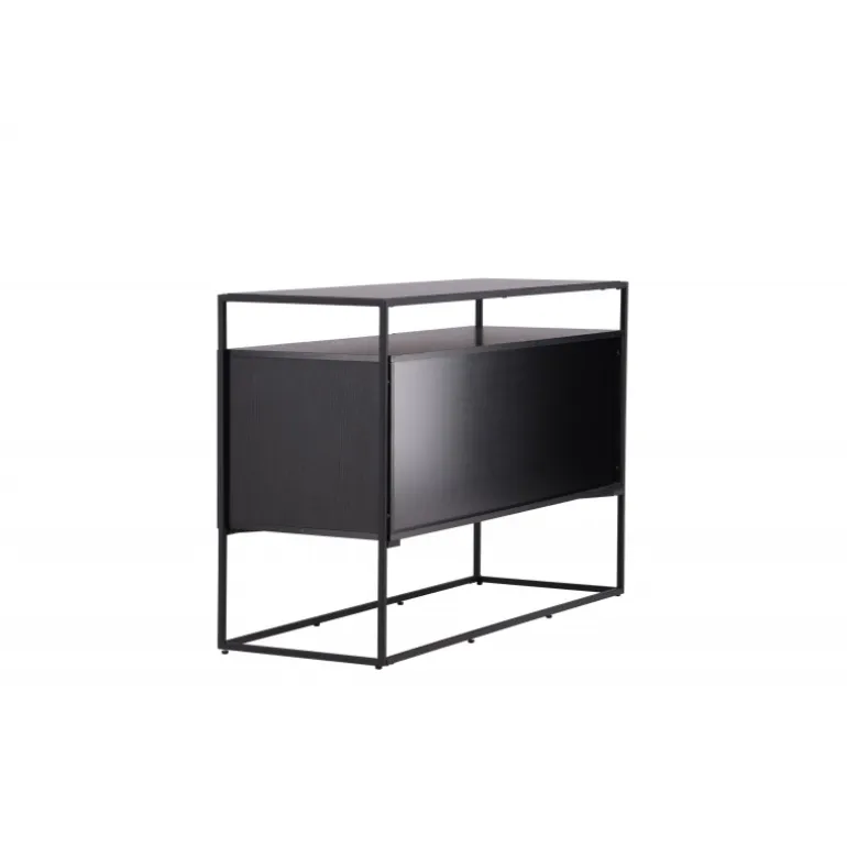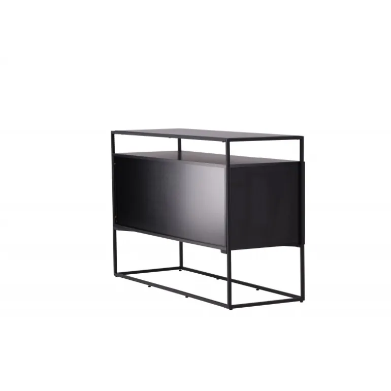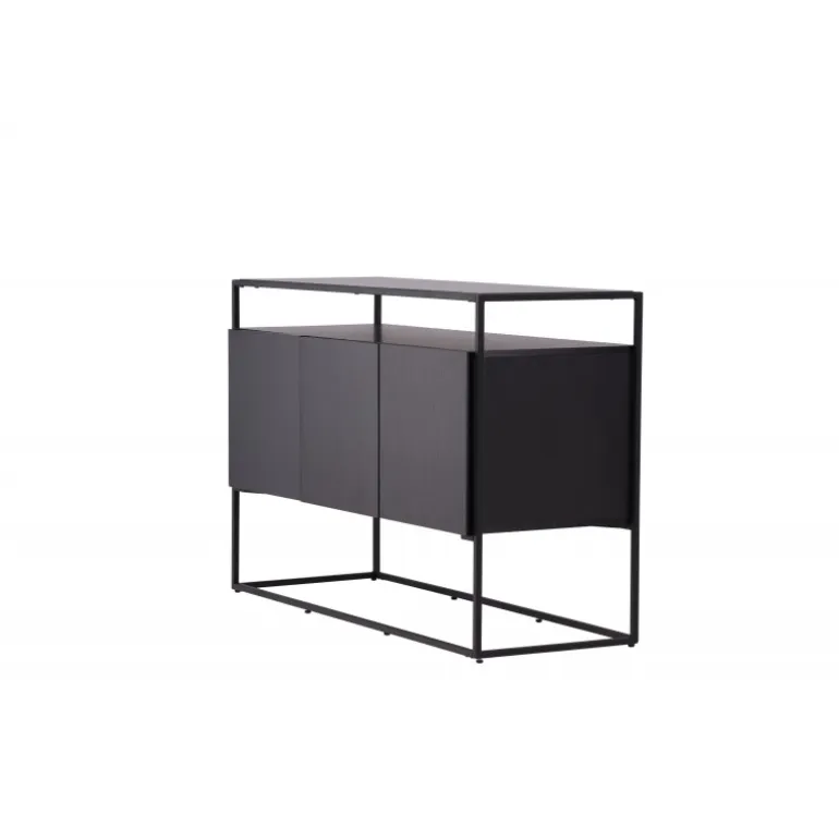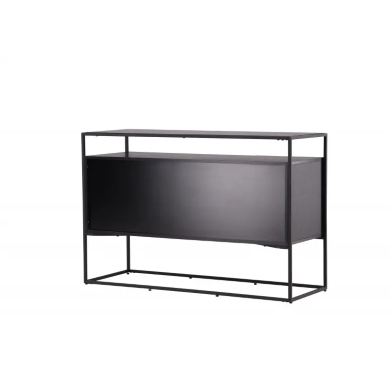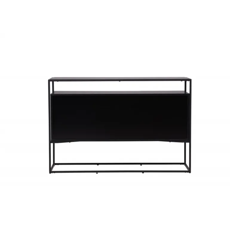 Kingsport Skabet kombinerer både skjult og synlig opbevaring og er lige så praktisk som det er stilfuldt! Takket være den generøse størrelse og tre hylder, er det rummeligt med plads til alle former for opbevaring, der skal placeres smart og stilfuldt. Lavet af sort MDF med en sort ramme i stål. Den minimalistiske ramme giver et elegant indtryk og gør det også nemt at støvsuge. Pynt bordpladen med smukke dekorationer og lysestager og fyld kontoret med alt, hvad du vil have der passer til!