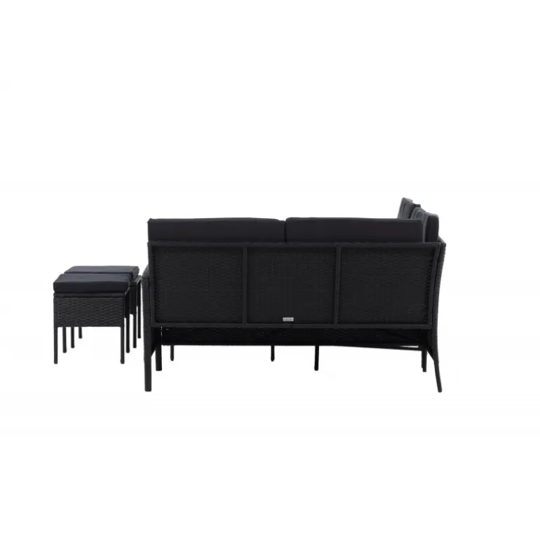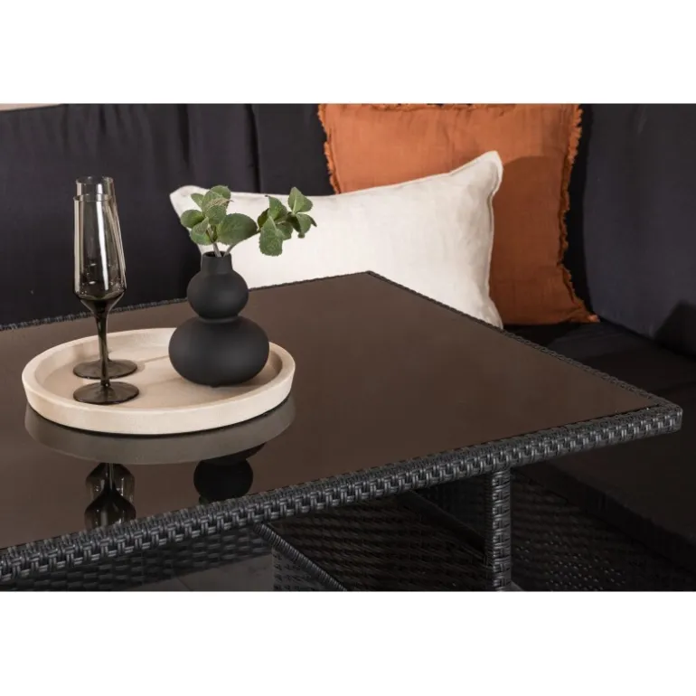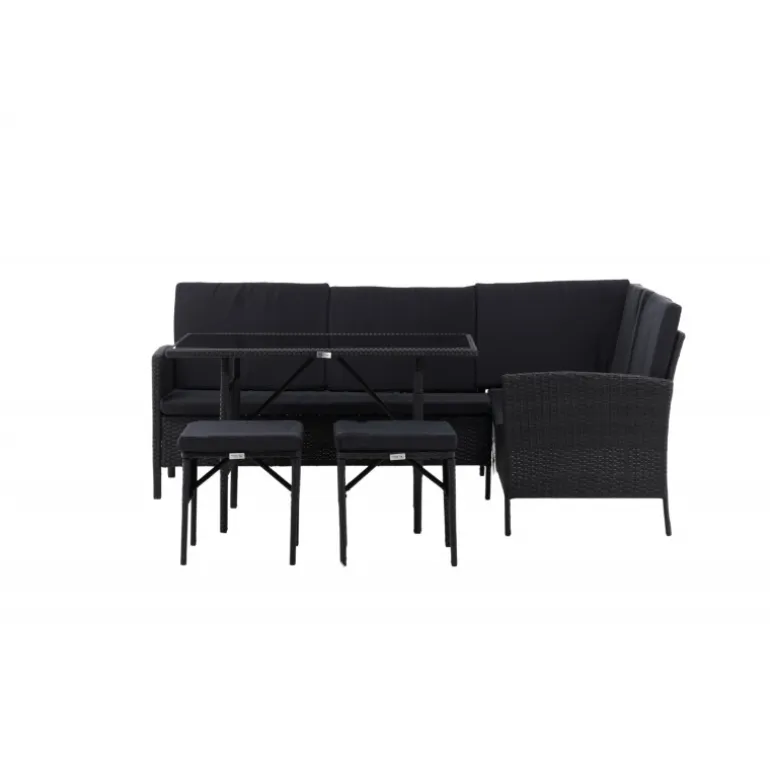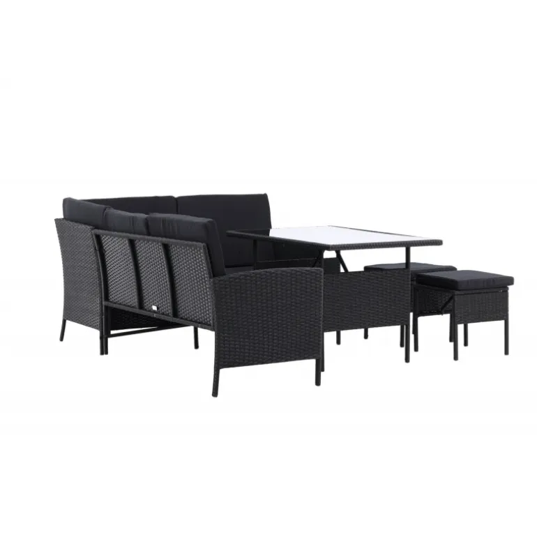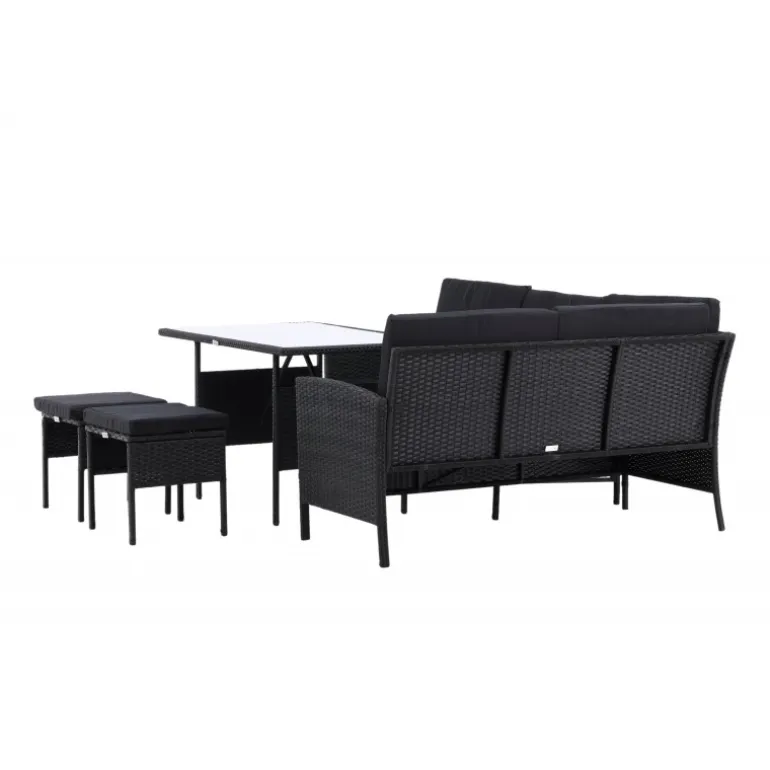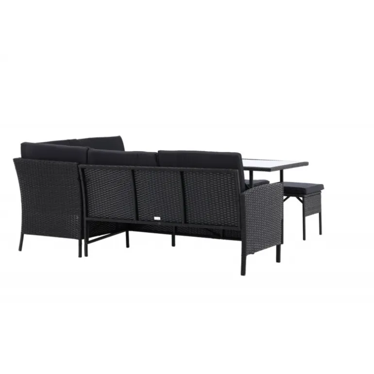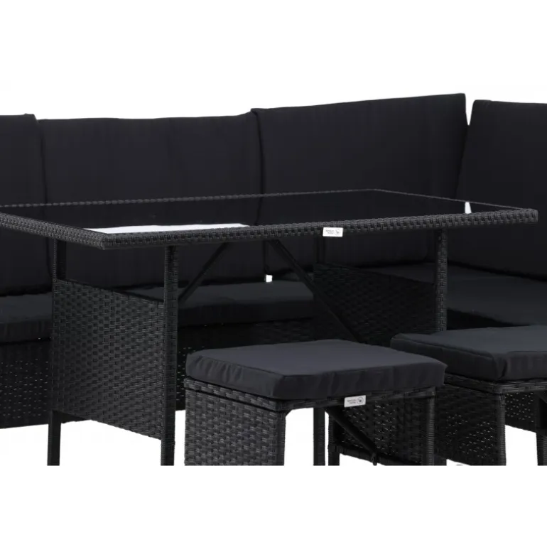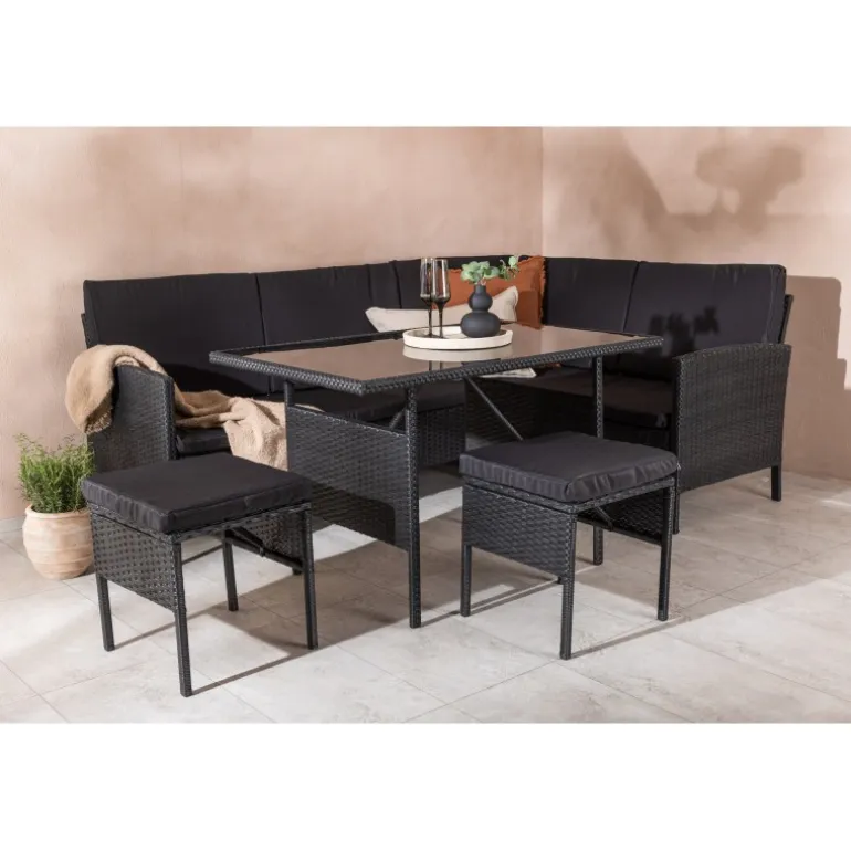 Knock hjørnesofa sæt er ideelt til din terrasse eller have og er designet med fokus på komfort og tidløs stil. Sættet består af en hjørnesofa i sort kunstig rattan med fire sæder og en hjørnedel, to skamler og et højere bord i kunstig rattan med glasbordplade. Sorte puder medfølger til sofaen og bidrager til en indbydende atmosfære! Vedligeholdelsesråd: Kunstig rattan er et plastmateriale, der er perfekt til det skandinaviske klima. Materialet er UV-resistent og kan tåle vejr og vind. Vi anbefaler dog altid at opbevare møblerne under et møbelovertræk eller et andet tørt og køligt sted for at forlænge levetiden. Sørg også for regelmæssigt at rengøre møblerne med mild sæbe og vand for at holde støv og snavs væk fra fibrene i materialet.