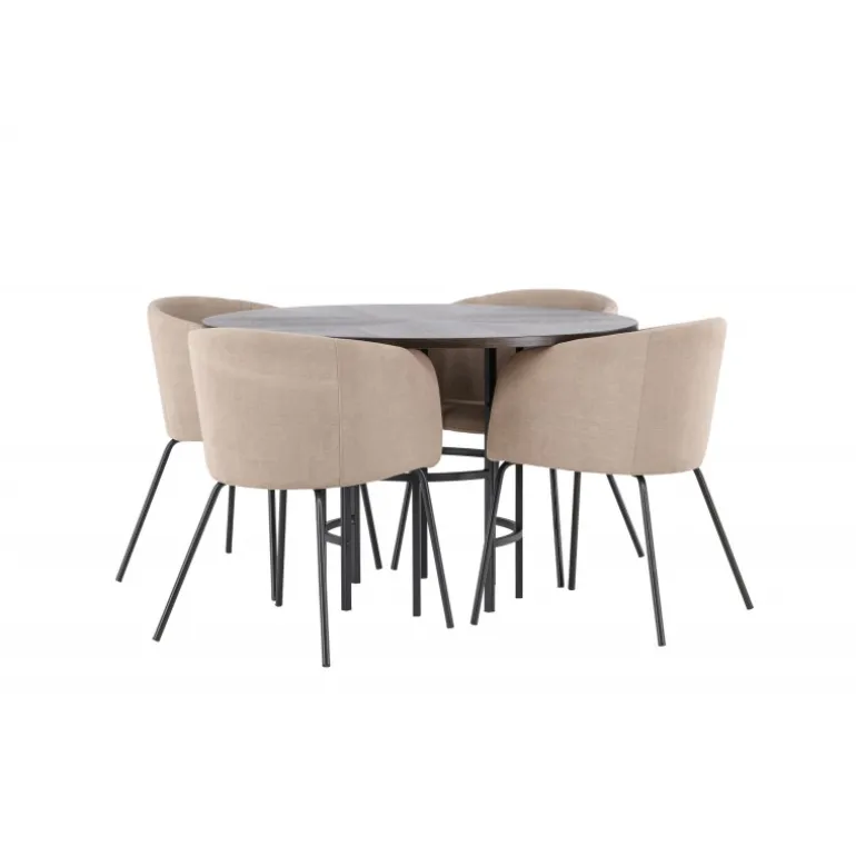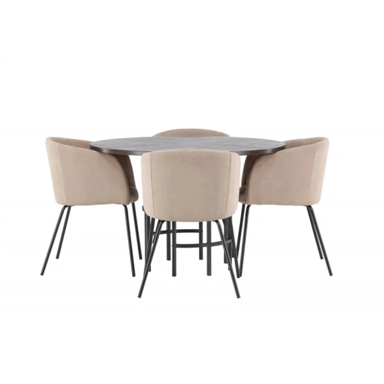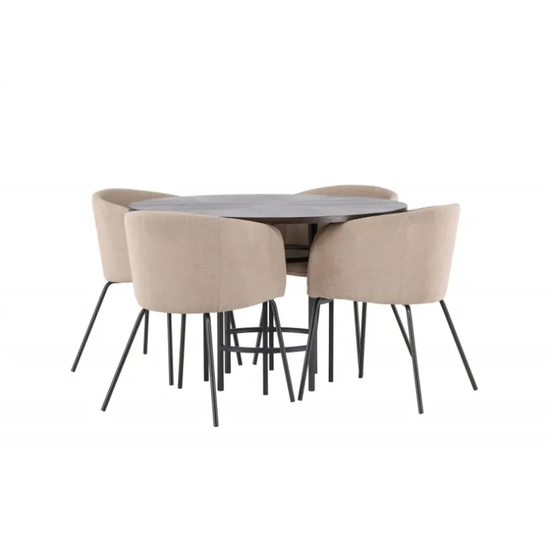 Oplev en utrolig Spisebordssæt med luksuriøst design! Vores runde spisebord København har en smuk brunfarvet bordplade i MDF med finer og en dekorativ, cylinderformet base i sort metal. Her sammen med vores komfortable spisebordsstole Berit. Stolen har et fuldt polstret design med en let afrundet ryg og sæde i polyesterlinned og smalle ben i sort jern. Her sidder du både behageligt og komfortabelt! Bordets diameter: 115 cm.