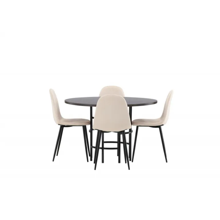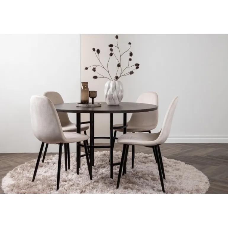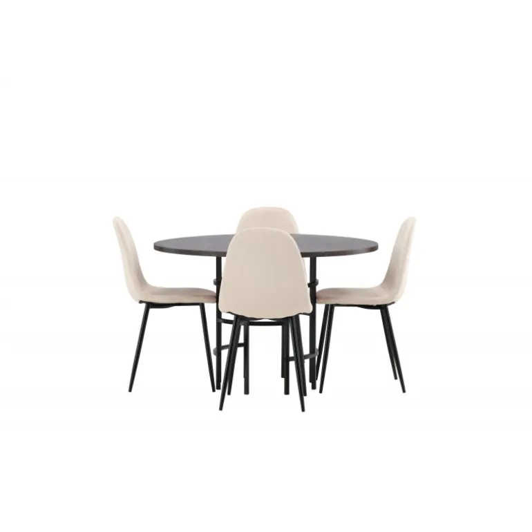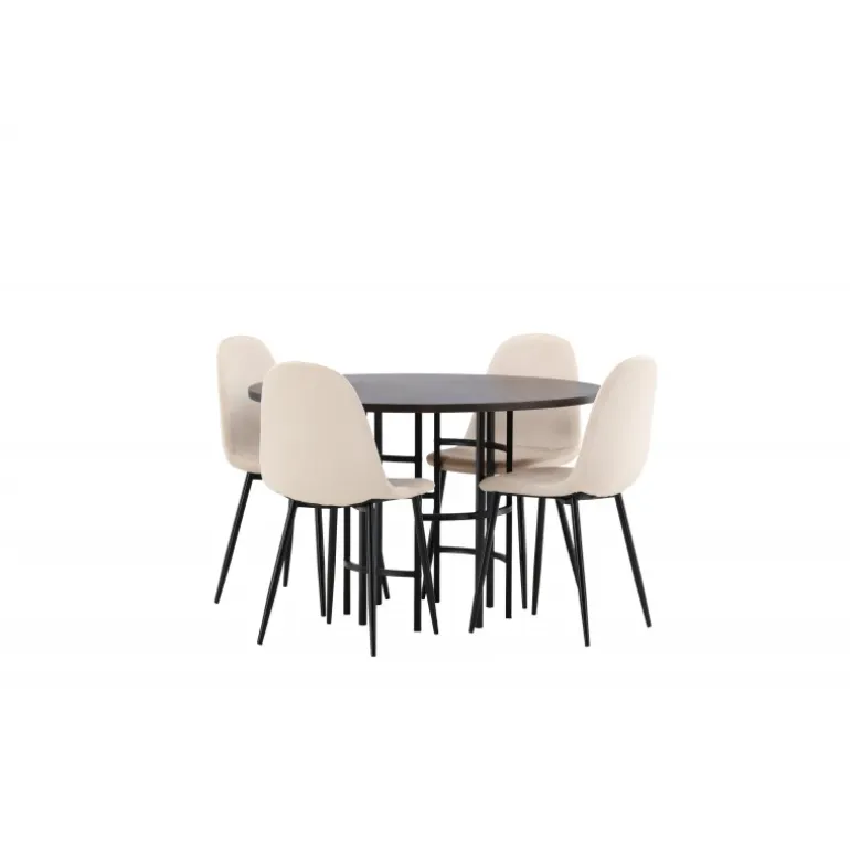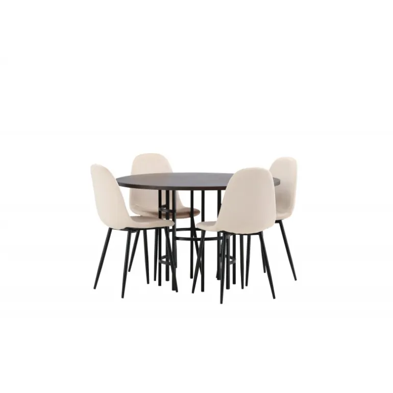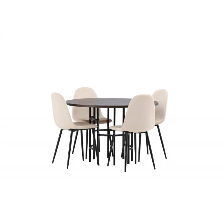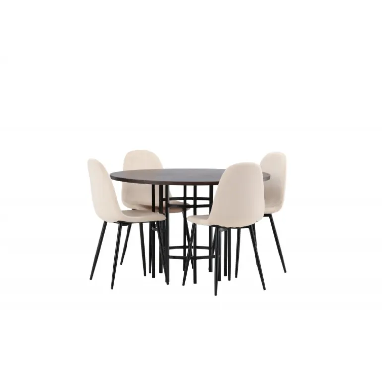 Stilfuldt, moderne og tidløst – en Spisebordssæt, der imponerer! Dette trend-sikre spisebord fra København-serien tilhører Furniture Fashion-kollektionen og har en smuk brunfarvet bordplade i MDF med finer og en dekorativ, cylinderformet base i sort metal. Her sammen med vores komfortable spisebordsstole fra Polar-serien. Stolen har et fuldt polstret design med en afrundet ryg og sæde i beige velourstof med blød polstring og ben i sort pulverlakeret metal. Undgå at gå på kompromis mellem komfort og design!