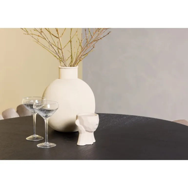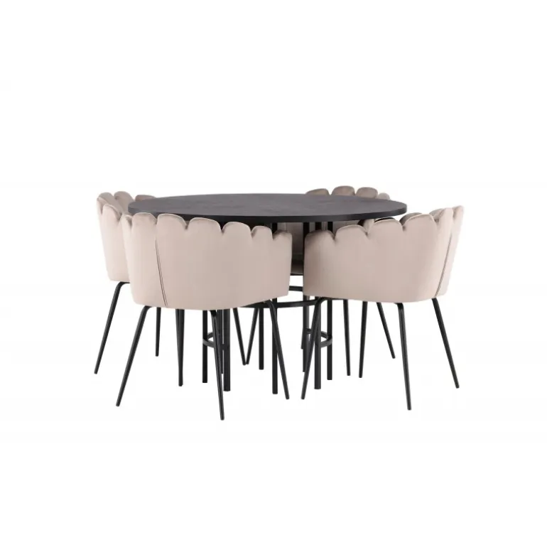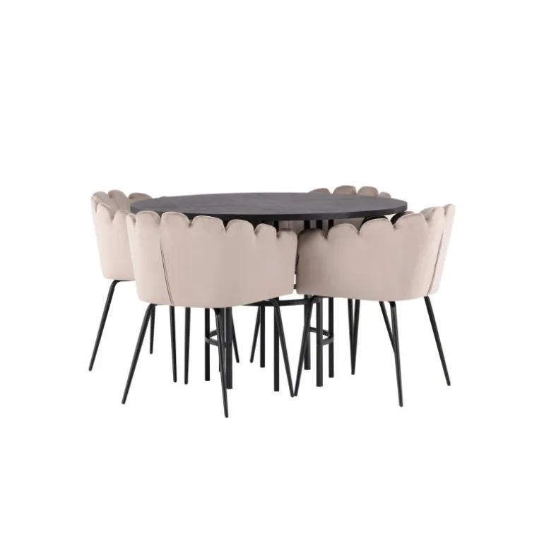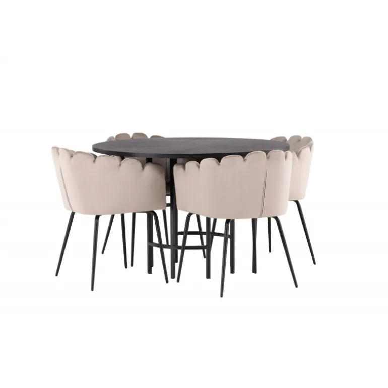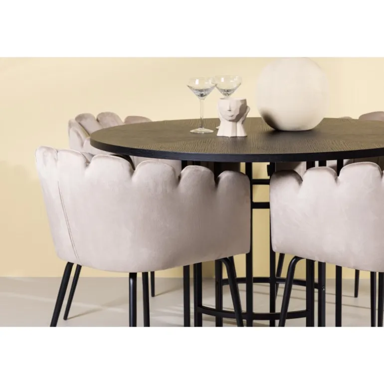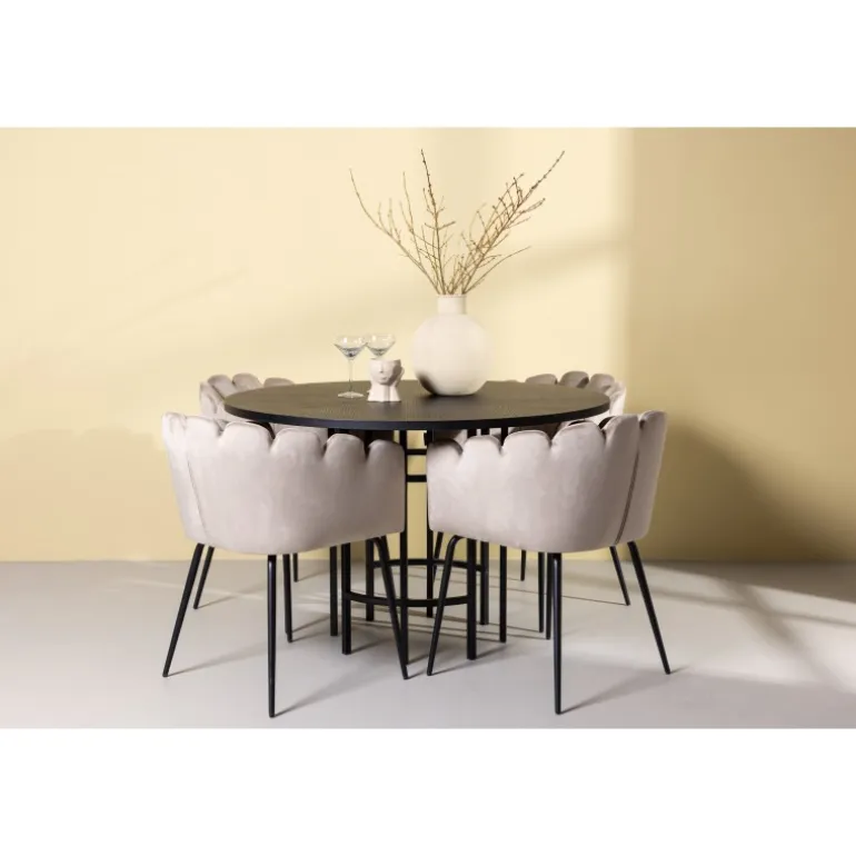 Det skal føles godt at komme hjem og slå sig ned! Vores runde spisebord København har en elegant, sort bordplade i MDF og en dekorativ, cylinderformet base i sort metal. Her sammen med vores populære spisestole Limhamn. Stolen har et indbydende design med en dekorativ muslingeskal-formet ryg med dekorative sting og et rundt sæde i smagfuld beige velourstof. Benene er i sort pulverlakeret metal. En uimodståelig Spisebordssæt! Borddimensioner: 115 cm.