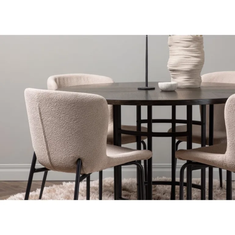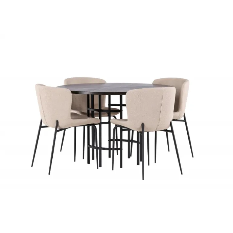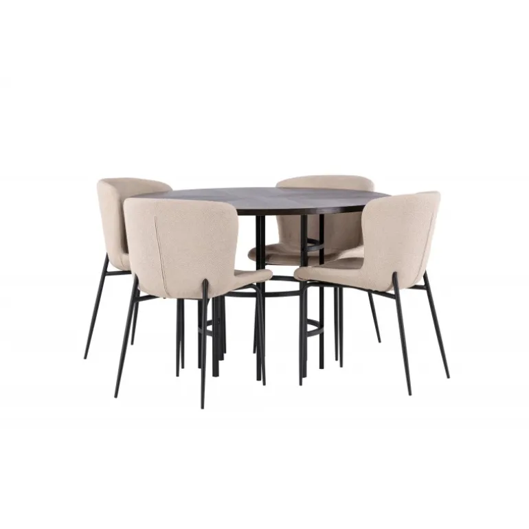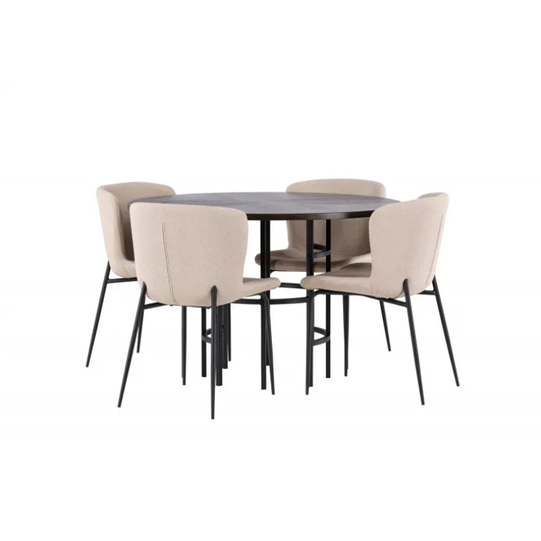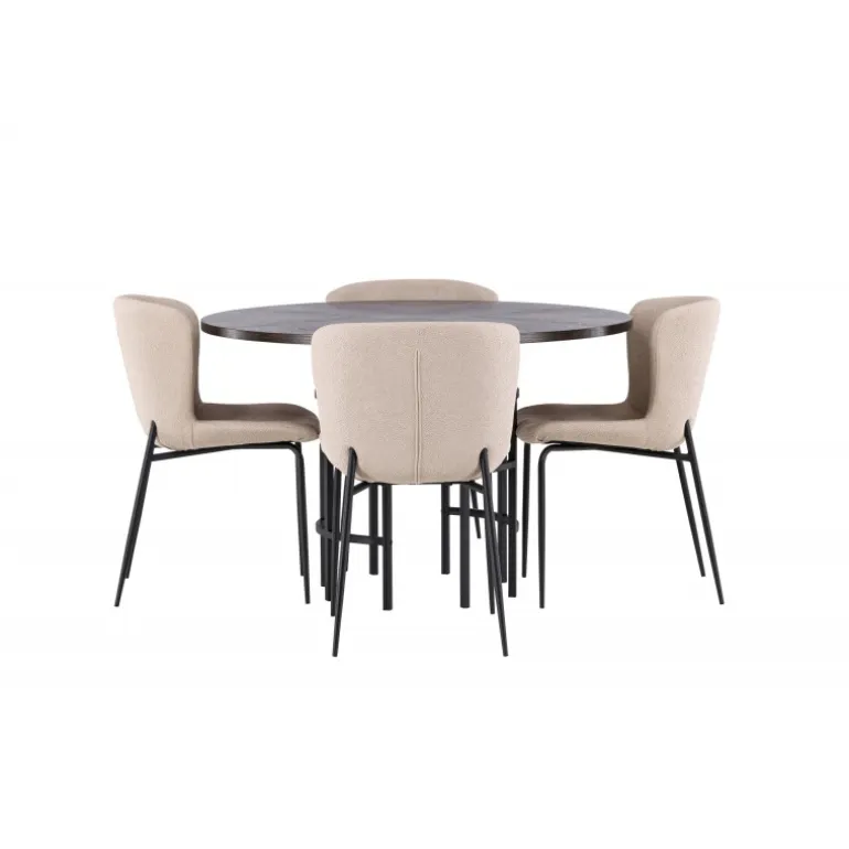 Et Spisebordssæt, der opfylder alle dine ønsker! Vores runde spisebord København har en smuk brunfarvet bordplade i MDF med finer og en dekorativ, cylinderformet base i sort metal. Her sammen med modebevidste spisestole fra Modesto-serien. Stolen er fuldt polstret i beige plys stof med stilfulde, smalle ben i sort metal. Den let afrundede ryg og polstrede sædepude giver ekstra komfort og forlænger hyggelige måltider rundt om spisebordet. Det bliver ikke bedre end dette! Bordmål: 115 cm.