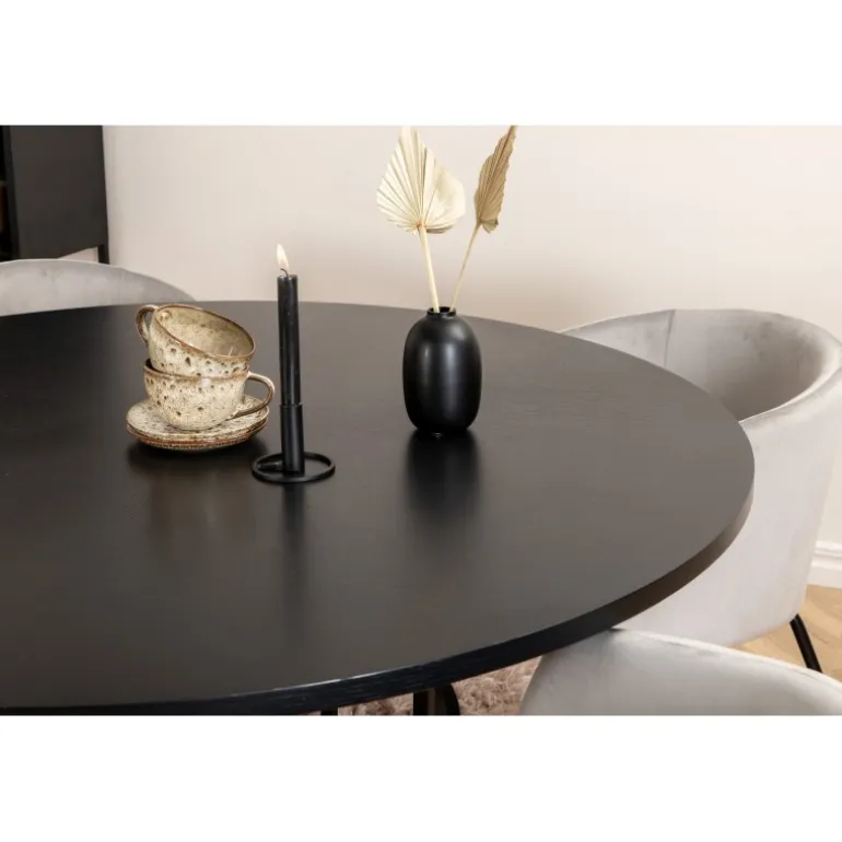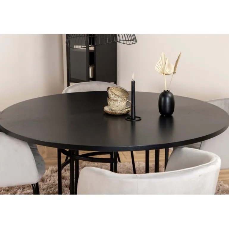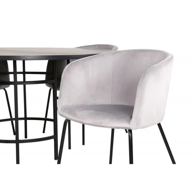 Skab et charmerende midtpunkt i hjertet af hjemmet med et rundt Spisebordssæt i et moderne look! København Spisebordssæt har et tidløst design i en konsekvent sort farve med en bordplade i MDF med finer og et dekorativt, cylindrisk formet metalstel. Bordets dimensioner: Diameter: 140 cm, Højde: 74 cm. Her matches det med 4 Berit spisebordsstole i et luksuriøst design. Stolene har et komfortabelt sæde i lys grå fløjl og stilfulde, smalle ben i jern. Stolens dimensioner: Højde: 78 cm, Sædehøjde: 49 cm, Bredde: 55 cm, Dybde: 55 cm. Indret til en hyggelig middagstid!