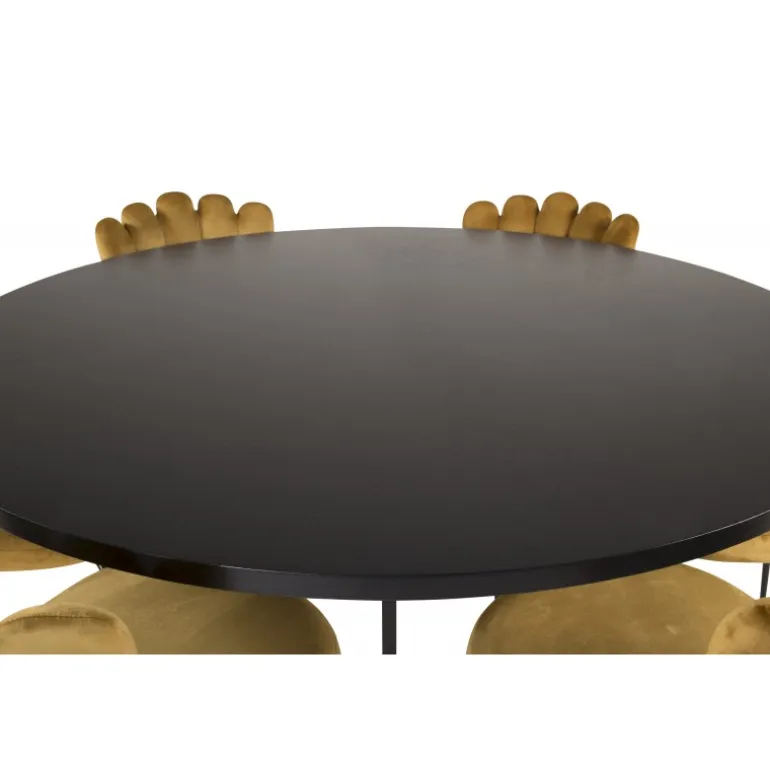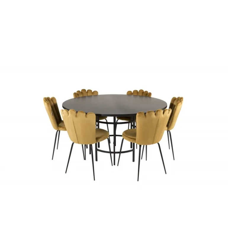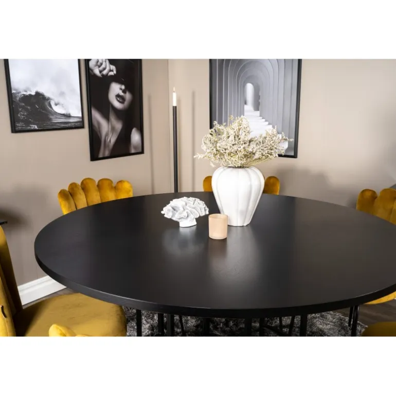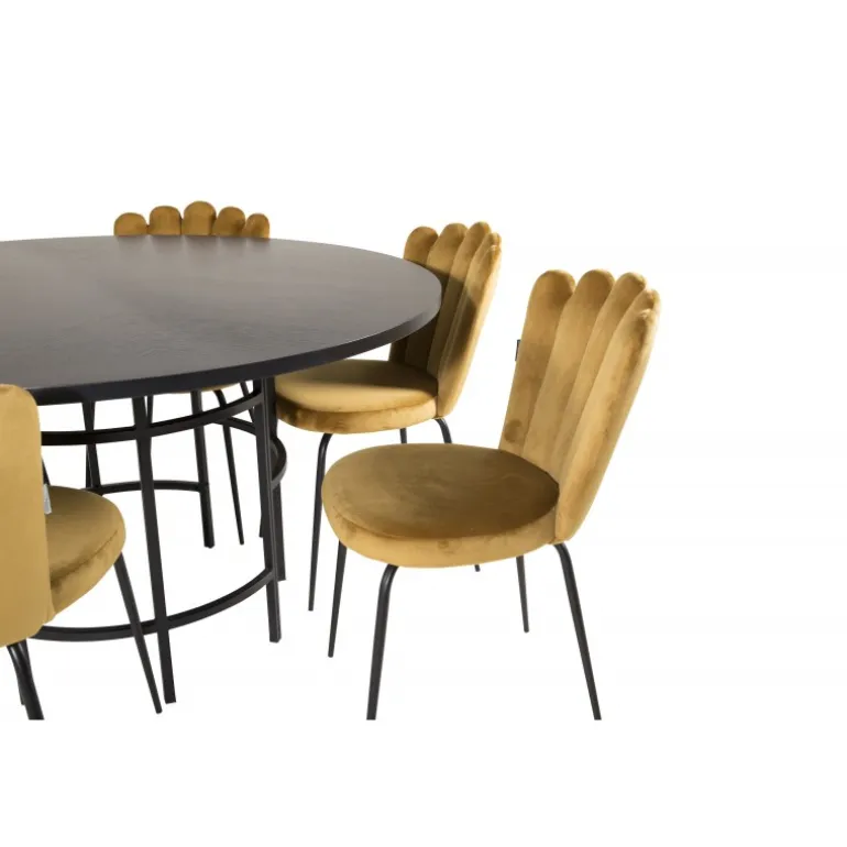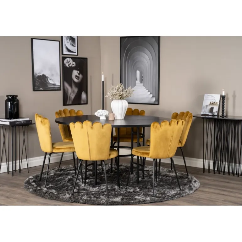 At købe en forudkomponeret Spisebordssæt er både trendsikker og praktisk! Her kombinerer vi vores spisebord København med vores siddevenlige spisebordsstole Limhamn. Lad hjemmets hjerte blive præget af din nye iøjnefaldende Spisebordssæt. Det sorte bord med gulddetaljer og de gule stole skaber et stilfuldt og moderne look i din spisestue.