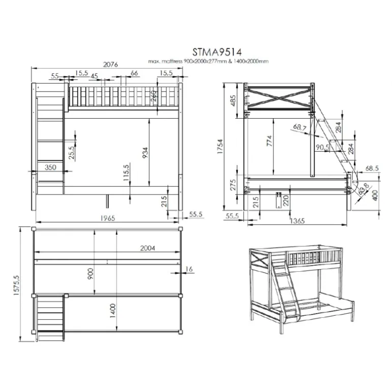 Køjeseng Scott familieseng 140×200 + 90×200 – hvid