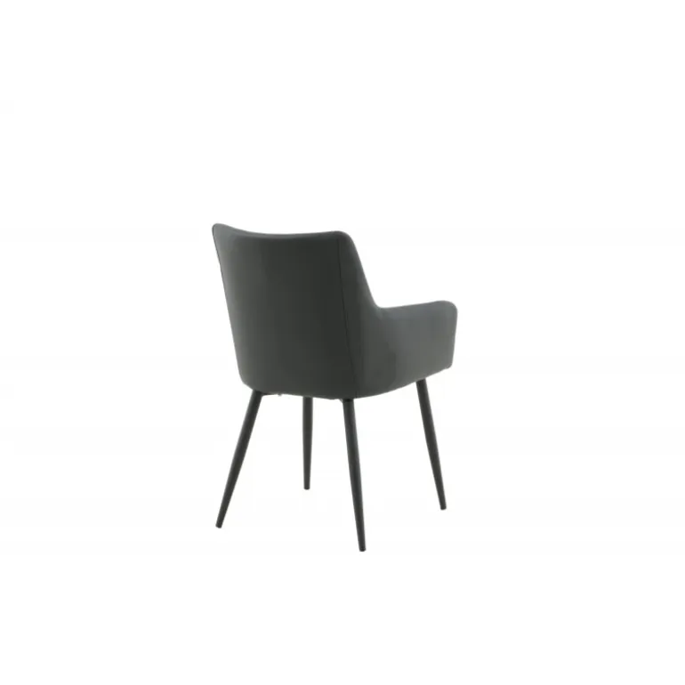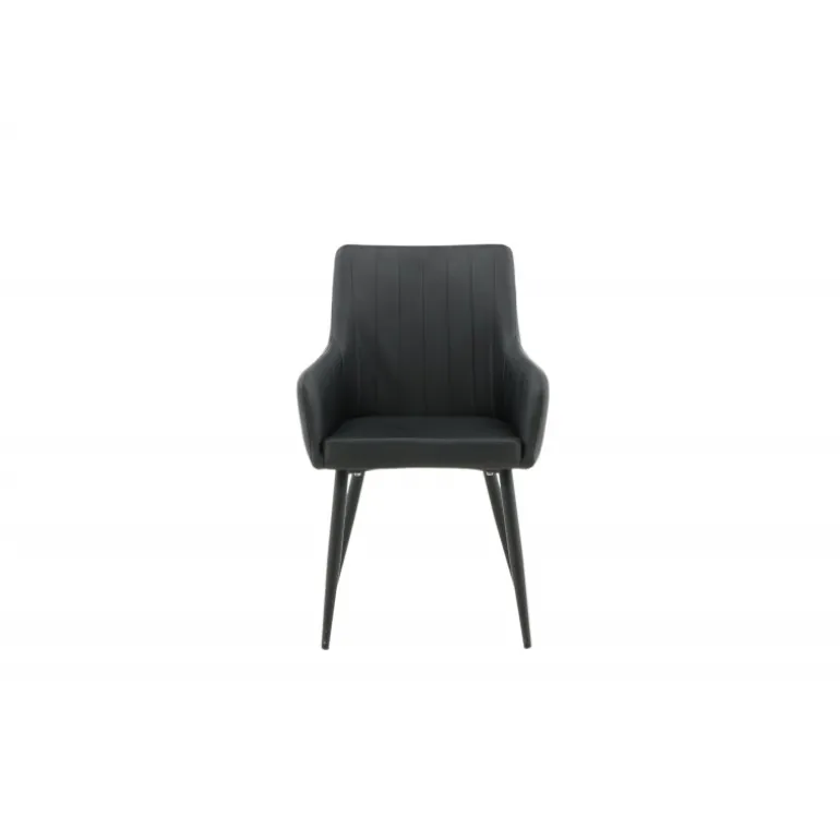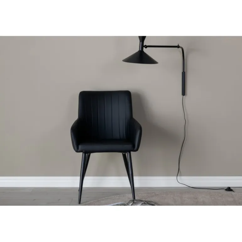 Komfort Stol fra serien Komfort er en elegant spisebordsstol i et robust og fuldt beklædt design med ben i sort pulverlakeret metal. Ryglæn og sæde med integrerede armlæn er udført i sort kunstlæder, hvilket sikrer en behagelig siddekomfort. Dekorative syninger på indersiden af ryglæn og armlæn giver en stilfuld detalje. Sid bekvemt og inviter til hyggelige måltider fremover! Lettere montering kræves. Plejeråd: Ved svære pletter, brug en fugtig bomuldsklud og et middel beregnet til rengøring af bycast & PU. Test først på et ikke synligt område, da nogle midler kan have forskellige sammensætninger. Tør af og polér med en blød bomuldsklud for at genskabe møblets højglans overflade.