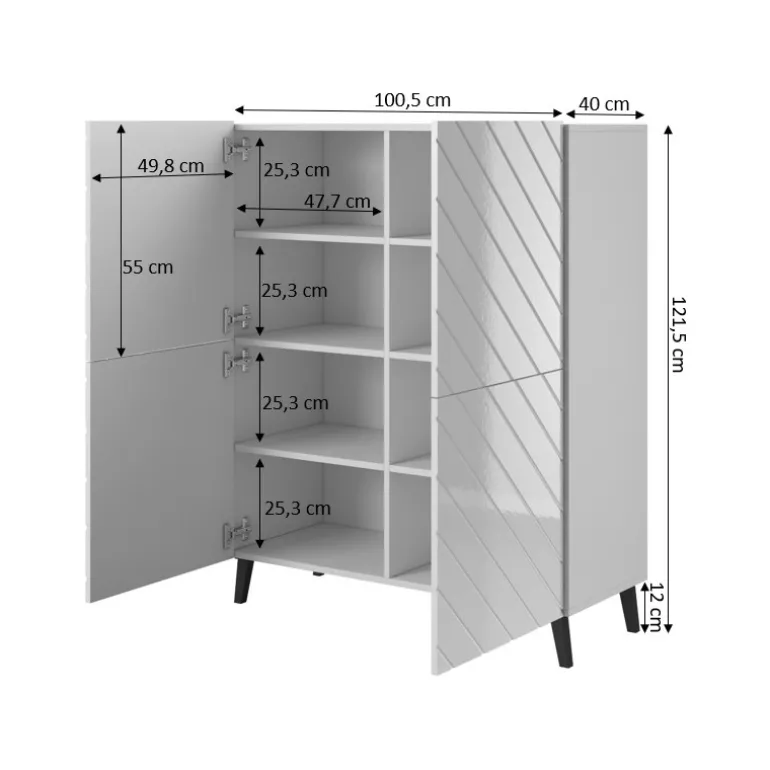 Opdag den moderne og stilfulde Kommode ABETO mat grafit/ glans grafit, perfekt til ethvert hjem. Med dimensionerne 121,5cm x 100,5cm x 40cm er denne kommode ideel til opbevaring af tøj, bøger eller andre genstande. Fremstillet af mat lamineret spånplade til kroppen og lamineret MDF-plade beklædt med folie til fronten, sikrer kommoden både holdbarhed og et elegant udseende. ABS-kanter og plastben i Sort farve tilføjer ekstra robusthed og stil, mens det innovative SYSTEM PUSH CLICK-håndtag gør åbning og lukning nem og problemfri. Denne kommode leveres i to pakker for nem transport og montering.