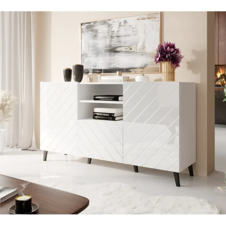 Opdater dit hjem med Kommode ABETO i en elegant kombination af mat hvid og blank hvid. Denne rummelige kommode er designet til at opfylde dine opbevaringsbehov med stil. Med en højde på 82 cm, bredde på 150 cm og dybde på 41,6 cm passer den perfekt til ethvert rum. Kroppen er lavet af mat lamineret spånplade, mens fronten er af lamineret MDF-plade beklædt med folie. Kanterne er forstærket med ABS, og benene er i Sort plastik. Uden håndtag, da fronten strækker sig ud over toppen, giver denne kommode et moderne og minimalistisk udseende.