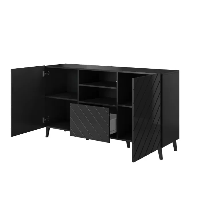 Kommode ABETO mat hvid/glans hvid kombinerer moderne design med funktionalitet. Med dimensionerne højde: 82 cm, bredde: 150 cm, og dybde: 41,6 cm passer den perfekt ind i enhver stue eller soveværelse. Fremstillet af mat lamineret spånplade og lamineret MDF-plade beklædt med folie, sikrer denne kommode holdbarhed og et stilfuldt look. ABS kanter og Sorte plastben tilføjer et elegant touch. Fronten er designet uden håndtag, hvilket giver et minimalistisk og rent udtryk.