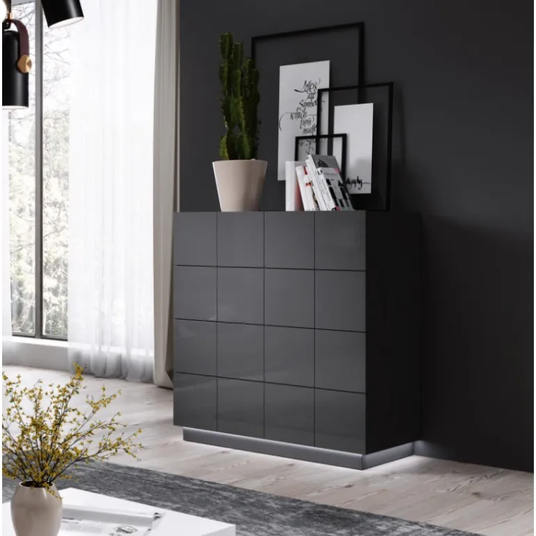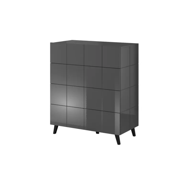 Oplev den stilfulde og funktionelle Kommode KOM4S REJA i elegant grafit glans. Denne kommode er designet til at passe perfekt ind i ethvert moderne hjem. Med sine dimensioner på 104 cm i højden (med ben) og 99 cm i højden (uden ben), 91 cm i bredden og 45 cm i dybden, giver den masser af opbevaringsplads uden at optage for meget gulvplads. Materialerne inkluderer glansfræsning MDF spånplade til sider og top samt lamineret spånplade til resten af elementerne. Kommoden har ingen håndtag, hvilket giver et rent og minimalistisk look, da fronten rækker over toppen. Den leveres med Sorte plastikben eller en sokkel og inkluderer en LED-strimmel til belysning, som kan fastgøres til soklen i enten hvid eller Blå farve.