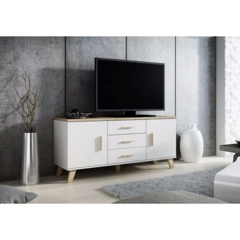 Oplev den elegante Kommode LOTTA 150 (2D3S) i en stilfuld kombination af diamant hvid og sonoma eg. Denne rummelige kommode er designet med både funktionalitet og æstetik i tankerne. Med dimensioner på h69cm x b150cm x d45cm og en benhøjde på 15 cm, tilbyder den rigelig opbevaringsplads uden at fylde for meget. Fremstillet af mat spånplade af høj kvalitet og robuste håndtag og ben i bejdset træ, er denne kommode både holdbar og smuk.