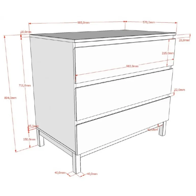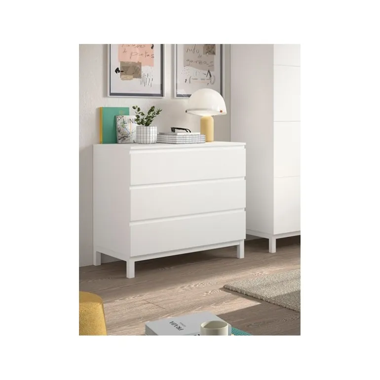 Kommode med 3 skuffer – Eva, hvid (90 × 200 cm)