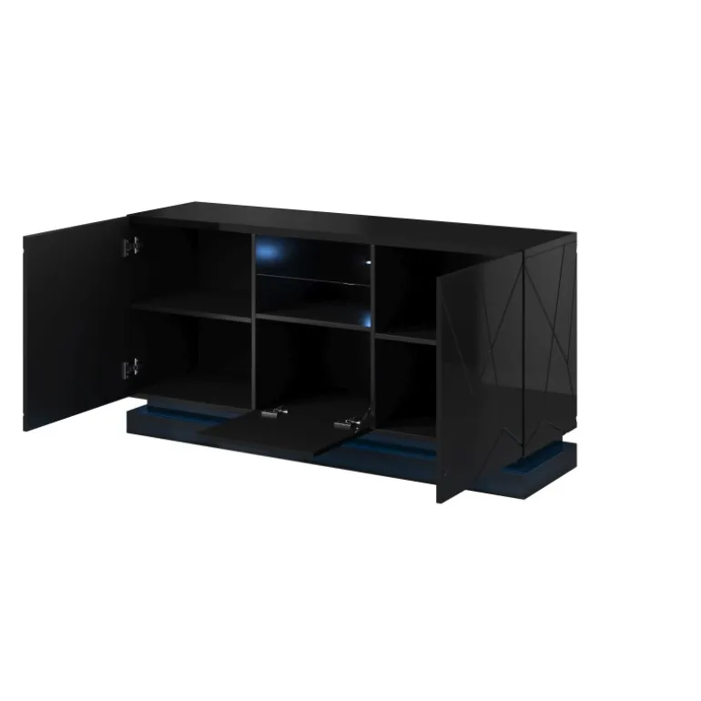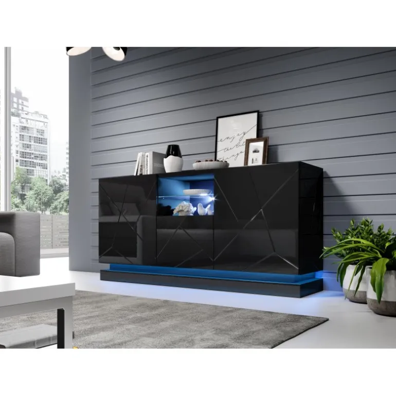 Giv dit hjem et elegant og moderne look med kommode QIU 2D1K i højglans Sort. Denne kommode er designet med højglans lamineret MDF-plader på både sider og fronter, hvilket giver et sofistikeret udseende. Med en højde på 75 cm, en bredde på 150 cm og en dybde på 41,5 cm tilbyder denne kommode rigelig opbevaringsplads. De synlige fræseværk på fronter og sider tilføjer en stilfuld detalje. Kommoden står på en solid sokkel, og de udtrækkende fronter fungerer som håndtag for et strømlinet design. Lys i Blå eller RGB farver kan bestilles separat, hvilket gør det muligt at tilpasse belysningen efter din stil.