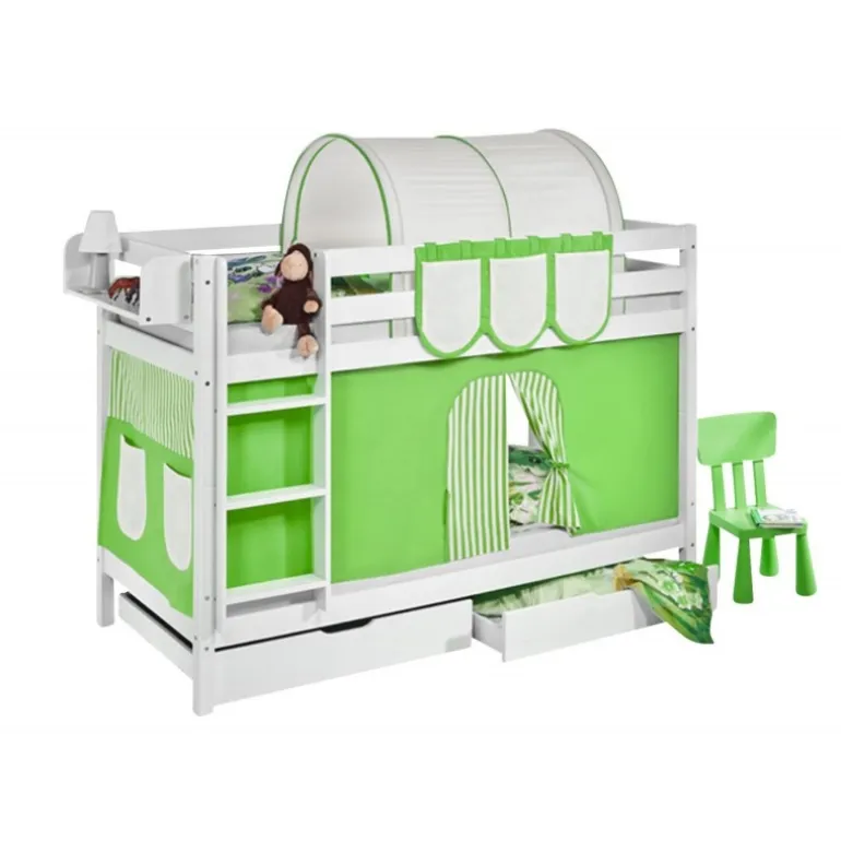 Har du brug for plads til to og ønsker den komplette løsning? Men dette sæt fra serien Bumle kan dine børn trygt lege, sove og drømme. Sengen kommer inkl. forhæng med grønt og beige tema, 2 bundskuffer samt madrasser og lamelbunde. Sengen er udstyret med flytbar stige med gode brede trin, som kan monteres i enten højre eller venstre side. Bumle er serien til dig som går op i kvalitet og tidløst design men ikke vil betale for dyre mærkevarer.