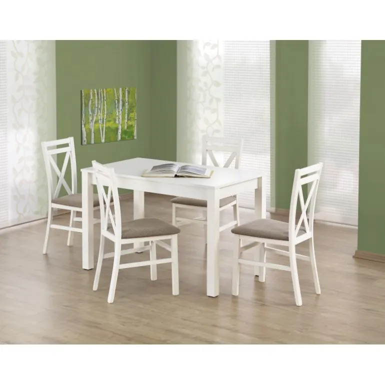 Oplev det elegante KSAWERY bord i hvid, som passer perfekt ind i ethvert moderne hjem. Med dimensionerne 120/68/76 cm er dette bord ideelt til både spisestuer og arbejdsområder. Bordpladen er fremstillet af lamineret møbelplade med ABS-plastik på kanterne, hvilket sikrer holdbarhed og nem vedligeholdelse. Benene er lavet af lamineret MDF, som tilføjer stabilitet og et stilrent look. Dette bord er ikke kun funktionelt men også æstetisk tiltalende, hvilket gør det til et fremragende valg for enhver boligindretning.
