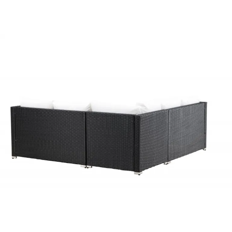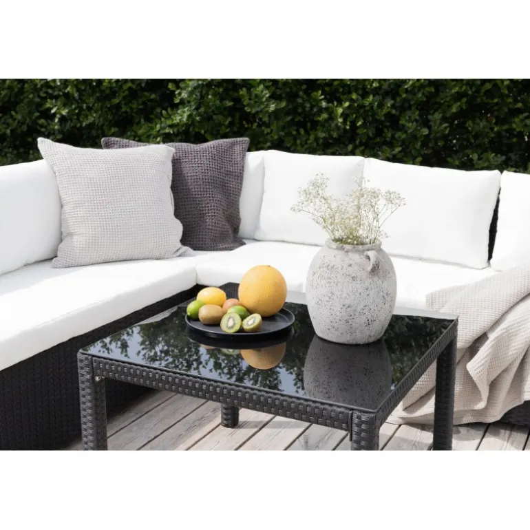Kuba, en moderne loungesæt i sort kunstig rattan af høj kvalitet, der garanteret vil gøre succes på terrassen eller altanen denne sommer. Loungesæt – Havemøbelsættet består af en hjørnesofa i modulform, som kan kombineres på flere måder, her med 4 sæder og et hjørne. Inkluderer hvide bløde puder og et rektangulært sofabord med en sort glasbordplade. Dimensioner: 180×180 cm. Let samling kræves. Her kan du og dine gæster sidde komfortabelt og nyde sene sommeraftener! Plejeråd: Konstriten er et plastmateriale, der er perfekt til vores skandinaviske klima. Materialet er UV-resistent og kan modstå vejr og vind. Det faktum, at det er UV-resistent betyder, at møblerne ikke falmer, men vi anbefaler altid at opbevare møblerne under et møbelbeskyttelse eller ellers tørt og køligt for at forlænge levetiden.