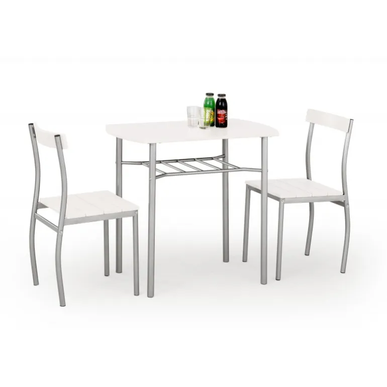 Oplev LANCE bord + 2 Spisebordsstole i elegant hvid farve, et stilfuldt og funktionelt spisebordssæt, der passer perfekt ind i ethvert moderne hjem. Bordet måler 82/50/75 cm og er fremstillet af holdbart laminat MDF, mens stellet er lavet af pulverlakeret stål, hvilket sikrer både stabilitet og langvarig brug. Dette sæt er ideelt for små rum og skaber en hyggelig atmosfære til dine måltider.